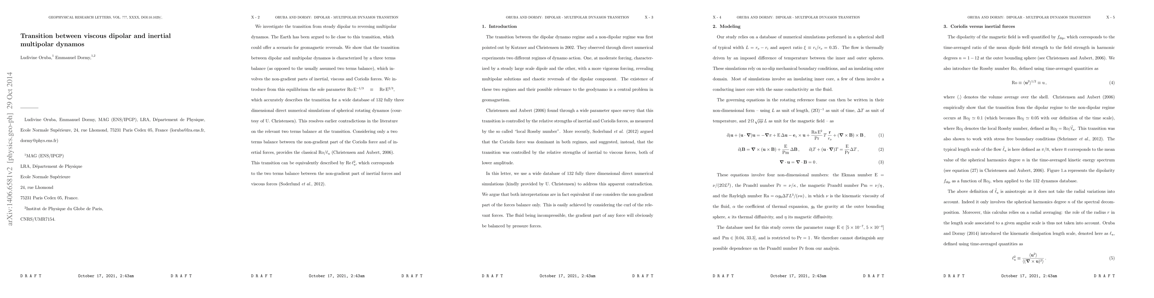 This paper investigates the transition from steady dipolar to reversing multipolar dynamos in Earth's core, revealing a three-term balance involving inertial, viscous, and Coriolis forces. The parameter ${{\rm Ro}}\,{{\rm E}}^{-1/3} \equiv {{\rm Re}}\,{{\rm E}}^{2/3}$ accurately describes this transition across 132 simulations, resolving previous contradictions regarding the two-term balance.