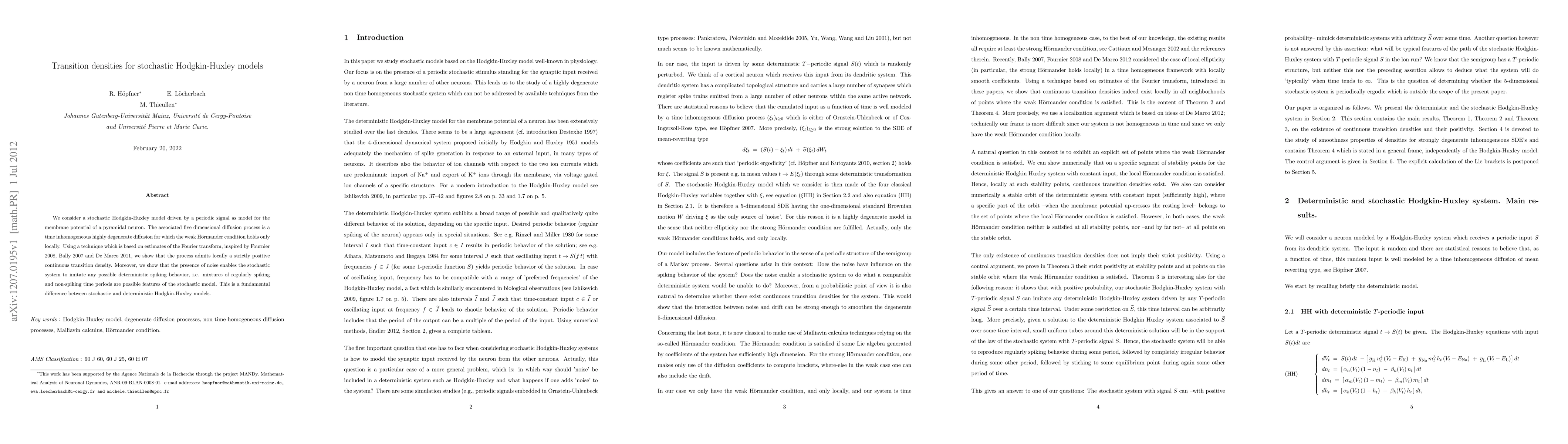 This paper investigates a stochastic Hodgkin-Huxley model driven by periodic signals, demonstrating that the associated five-dimensional diffusion process has a strictly positive continuous transition density. It highlights how noise allows the stochastic system to mimic various deterministic spiking behaviors, distinguishing it from its deterministic counterpart.