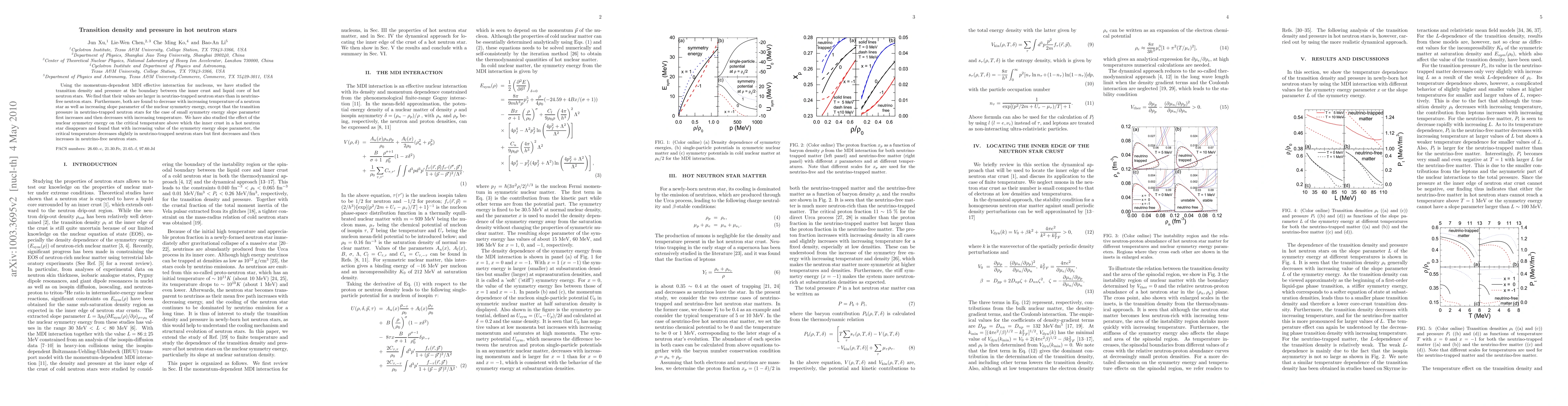 Research on hot neutron stars found that transition density and pressure vary with temperature and symmetry energy slope parameter, with neutrino-trapped stars showing different behavior than neutrino-free ones.