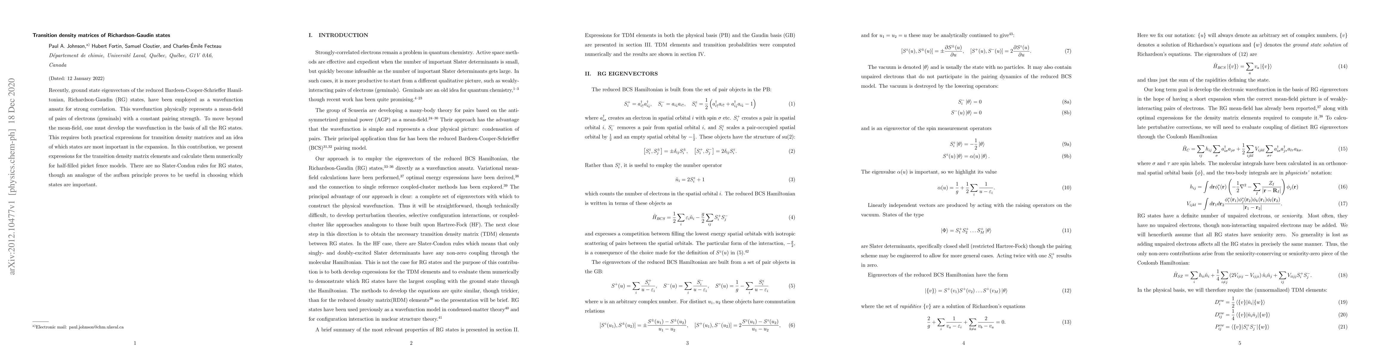 This paper presents expressions for transition density matrices for Richardson-Gaudin states and calculates them numerically for half-filled picket fence models. It also explores an analogue of the aufbau principle to identify significant states in the wavefunction expansion beyond mean-field approximations.