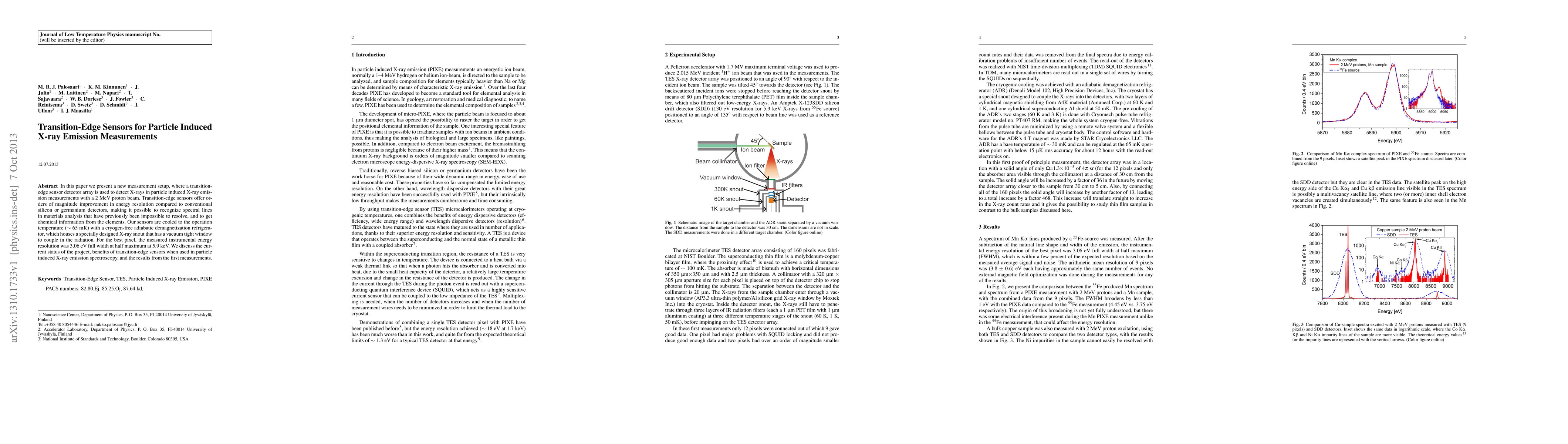 This paper introduces a new measurement setup using transition-edge sensors for particle-induced X-ray emission, achieving significant improvements in energy resolution over conventional detectors. The setup, cooled to 65 mK, demonstrates an instrumental resolution of 3.06 eV at 5.9 keV, enabling the resolution of previously undetectable spectral lines for material analysis.