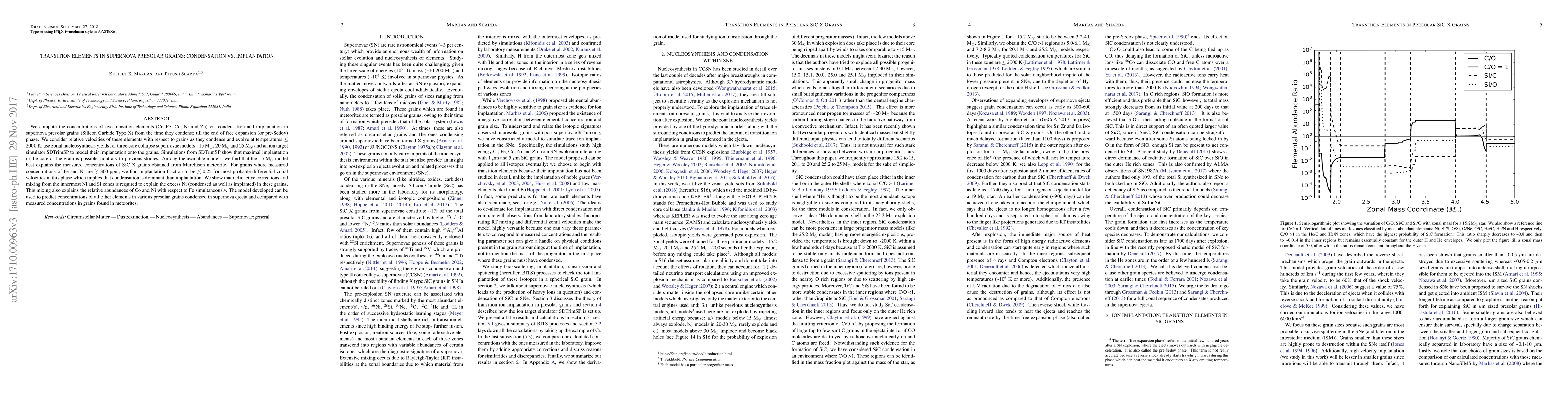 This study investigates the concentrations of transition elements in supernova presolar grains via condensation and implantation, finding that condensation dominates over implantation unless grains spend little time in the supernova environment. The 15 Mₒ model best fits observed SiC X grain concentrations from the Murchison meteorite.