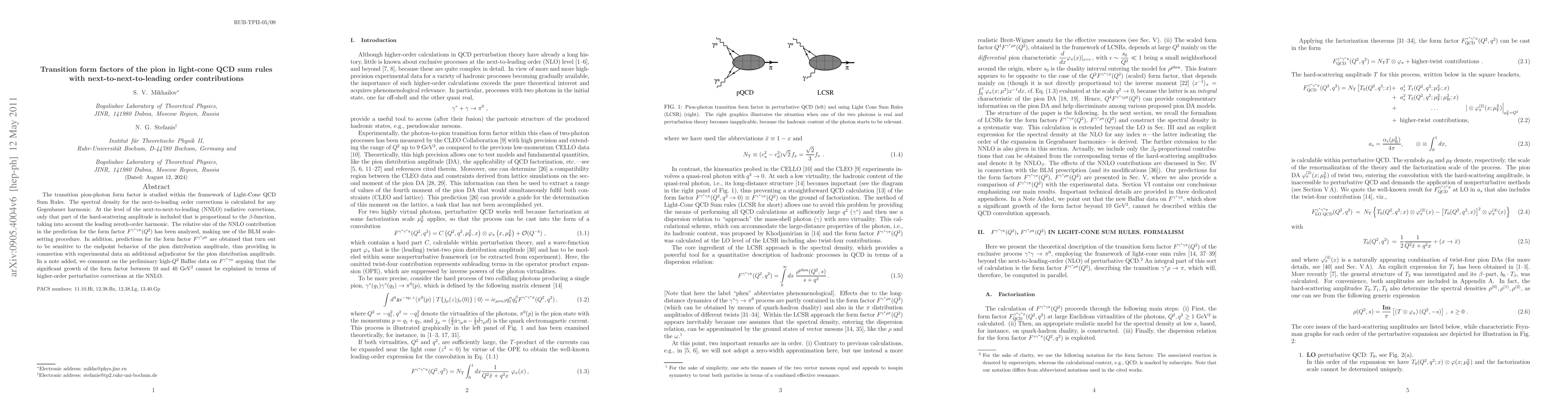 This paper investigates the pion-photon transition form factor using Light-Cone QCD Sum Rules with next-to-next-to-leading order (NNLO) contributions, analyzing the spectral density and the impact of NNLO radiative corrections. The results provide insights into the pion distribution amplitude and suggest that high-$Q^2$ BaBar data cannot be fully explained by NNLO corrections.
