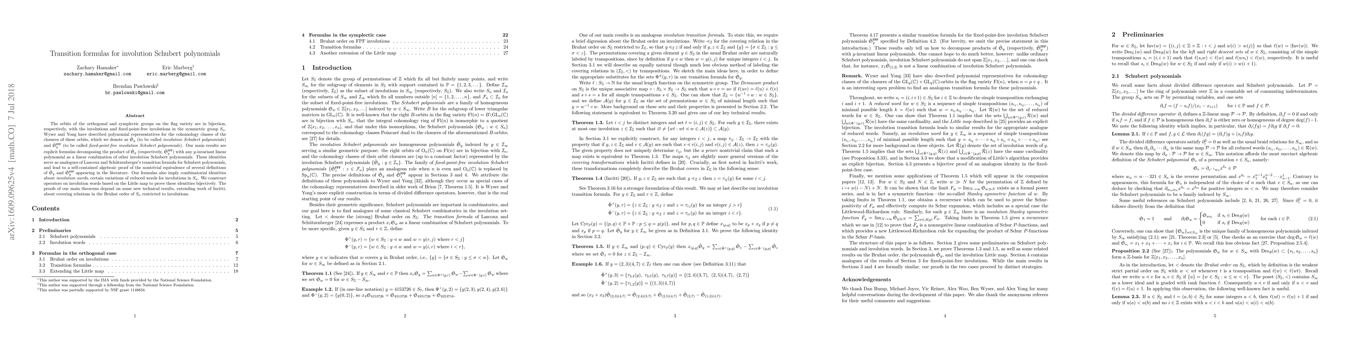 The paper presents explicit transition formulas for involution Schubert polynomials and fixed-point-free involution Schubert polynomials, analogous to Lascoux and Schützenberger's transition formula for Schubert polynomials. The formulas provide a self-contained algebraic proof of the equivalence of various definitions of these polynomials and imply combinatorial identities related to involution words.