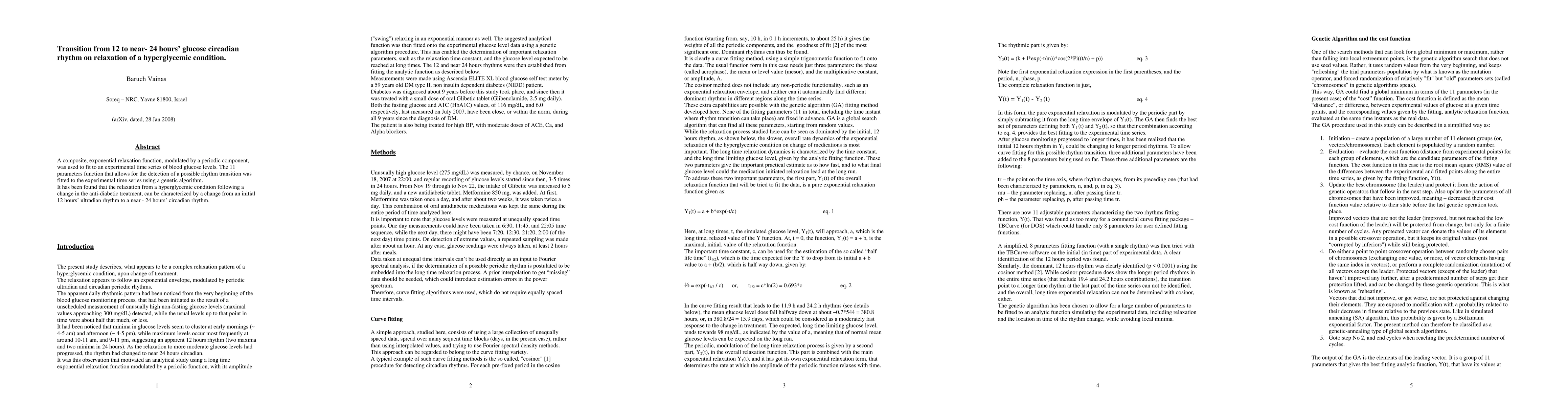 A composite, exponential relaxation function, modulated by a periodic component, was used to fit to an experimental time series of blood glucose levels. The 11 parameters function that allows for the detection of a possible rhythm transition was fitted to the experimental time series using a genetic algorithm. It has been found that the relaxation from a hyperglycemic condition following a change in the anti-diabetic treatment, can be characterized by a change from an initial 12 hours ultradian rhythm to a near-24 hours circadian rhythm.