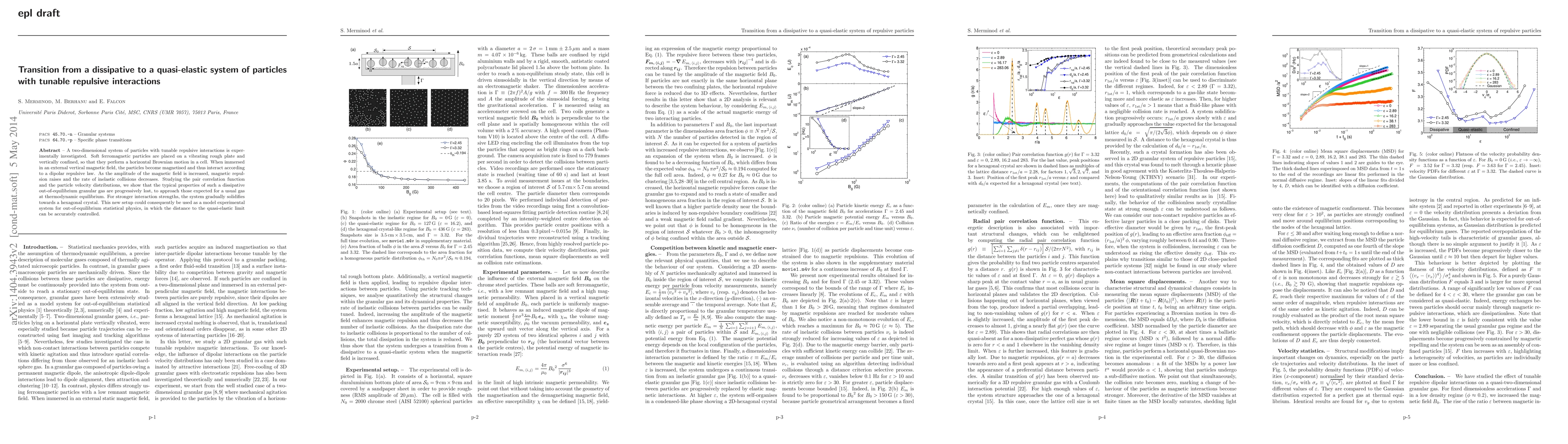 This research investigates a two-dimensional system of tunable repulsive magnetic particles on a vibrating plate, showing how increased magnetic field strength reduces inelastic collisions and transitions the system from a dissipative granular gas to a quasi-elastic state, potentially crystallizing into a hexagonal structure. The setup serves as a controllable model for out-of-equilibrium statistical physics studies.