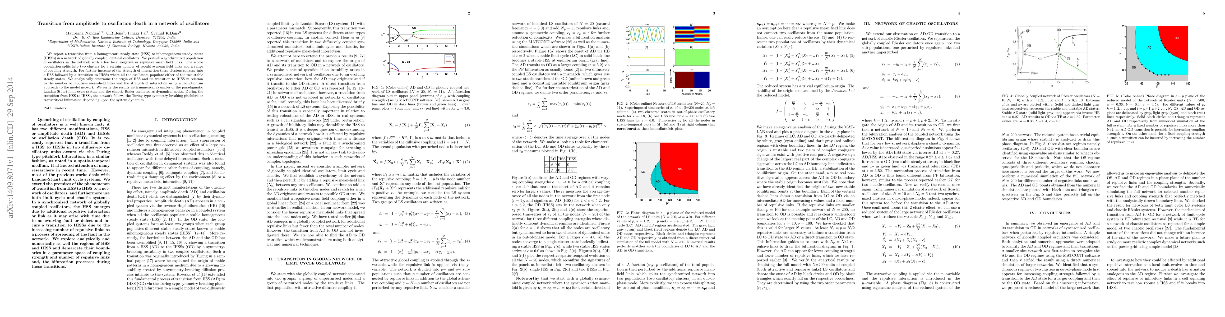 We report a transition from a homogeneous steady state (HSS) to inhomogeneous steady states (IHSSs) in a network of globally coupled identical oscillators. We perturb a synchronized population in the network with a few local negative mean field links. It is observed that the whole population splits into two clusters for a certain number of negative mean field links and specific range of coupling strength. For further increases of the strength of interaction these clusters collapse to a HSS followed by a transition to IHSSs. We analytically determine the origin of HSS and its transition to IHSS in relation to the number of negative mean-field links and the strength of interaction using a reductionism approach to the model network in a two-cluster state. We verify the results with numerical examples of networks using the paradigmatic Landau-Stuart limit cycle system and the chaotic Rossler oscillator as dynamical nodes. During the transition from HSS to IHSSs, the network follows the Turing type symmetry breaking pitchfork or transcritical bifurcation depending upon the system dynamics.