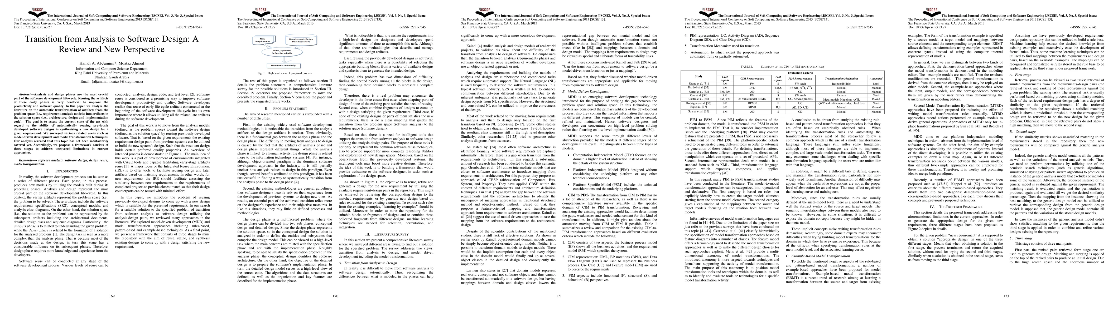 Analysis and design phases are the most crucial part of the software development life-cycle. Reusing the artifacts of these early phases is very beneficial to improve the productivity and software quality. In this paper we analyze the literature on the automatic transformation of artifacts from the problem space (i.e., requirement analysis models) into artifacts in the solution space (i.e., architecture, design and implementation code). The goal is to assess the current state of the art with regard to the ability of automatically reusing previously developed software designs in synthesizing a new design for a given requirement. We surveyed various related areas such as model-driven development and model transformation techniques. Our analysis revealed that this topic has not been satisfactorily covered yet. Accordingly, we propose a framework consists of three stages to address uncovered limitations in current approaches.