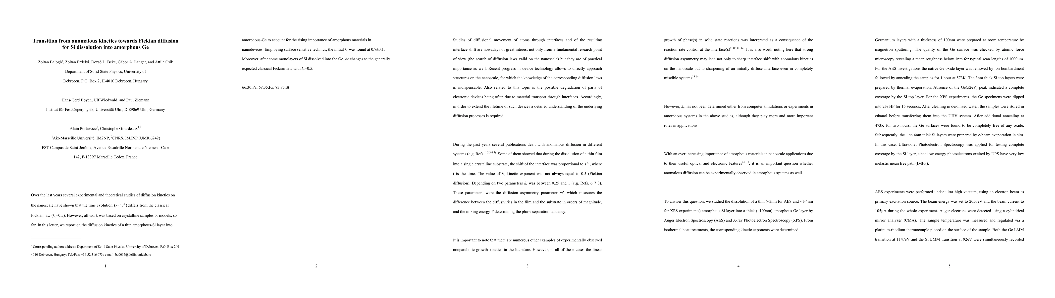 This paper investigates the diffusion kinetics of silicon in amorphous germanium, finding that initially, the diffusion follows anomalous kinetics (kc=0.7±0.1). Over time, as more silicon dissolves, the diffusion transitions to classical Fickian diffusion with kc=0.5.