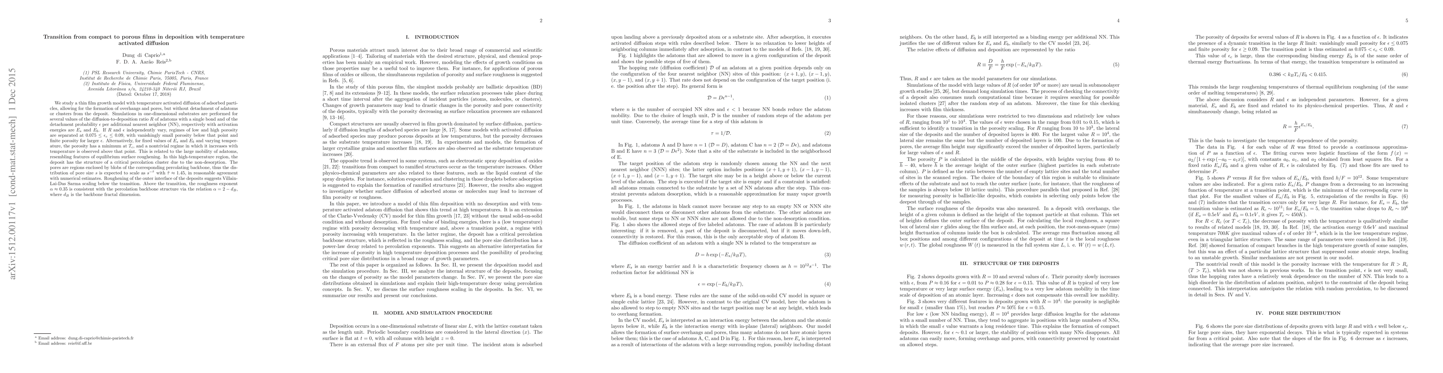 We study a thin film growth model with temperature activated diffusion of adsorbed particles, allowing for the formation of overhangs and pores, but without detachment of adatoms or clusters from the deposit. Simulations in one-dimensional substrates are performed for several values of the diffusion-to-deposition ratio R of adatoms with a single bond and of the detachment probability epsilon per additional nearest neighbor (NN), respectively with activation energies are Es and Eb. If R and epsilon independently vary, regimes of low and high porosity are separated at 0.075 < epsilon_c < 0.09, with vanishingly small porosity below that point and finite porosity for larger epsilon. Alternatively, for fixed values of Es and Eb and varying temperature, the porosity has a minimum at Tc, and a nontrivial regime in which it increases with temperature is observe above that point. This is related to the large mobility of adatoms, resembling features of equilibrium surface roughening. In this high-temperature region, the deposit has the structure of a critical percolation cluster due to the non-desorption condition. The pores are regions enclosed by blobs of the corresponding percolating backbone, thus the distribution of pore size s is expected to scale as s^{-tau} with tau ~ 1.45, in reasonable agreement with numerical estimates. Roughening of the outer interface of the deposits suggests Villain-Lai-Das Sarma scaling below the transition. Above the transition, the roughness exponent alpha ~ 0.35 is consistent with the percolation backbone structure via the relation alpha = 2-d_B, where d_B is the backbone fractal dimension.