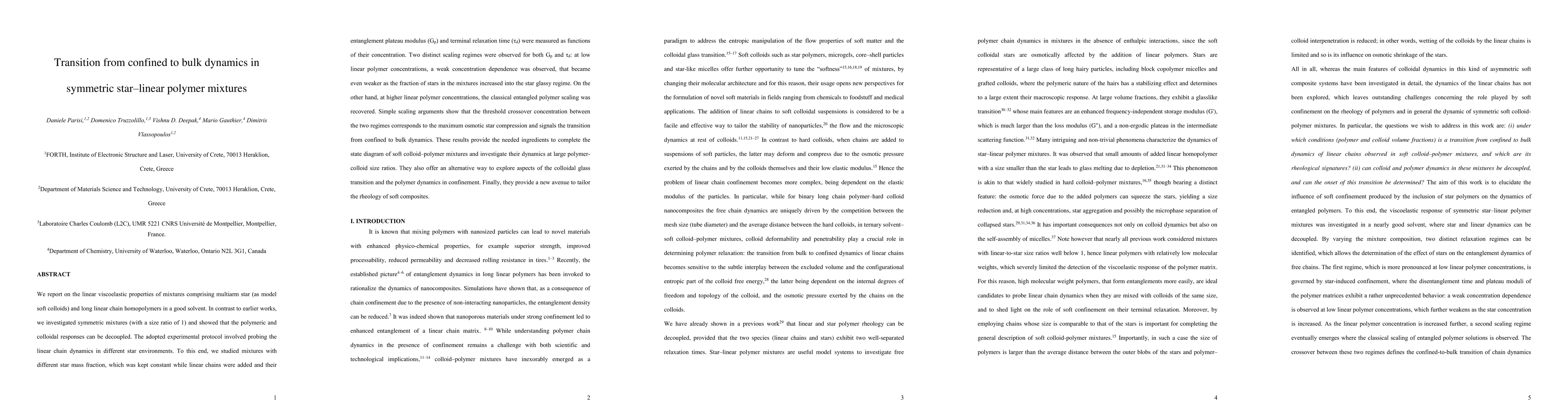 This paper investigates the linear viscoelastic properties of symmetric star-linear polymer mixtures, demonstrating decoupling of polymeric and colloidal responses. It reveals two distinct scaling regimes for entanglement plateau modulus and relaxation time, marking a transition from confined to bulk dynamics at a specific crossover concentration.
