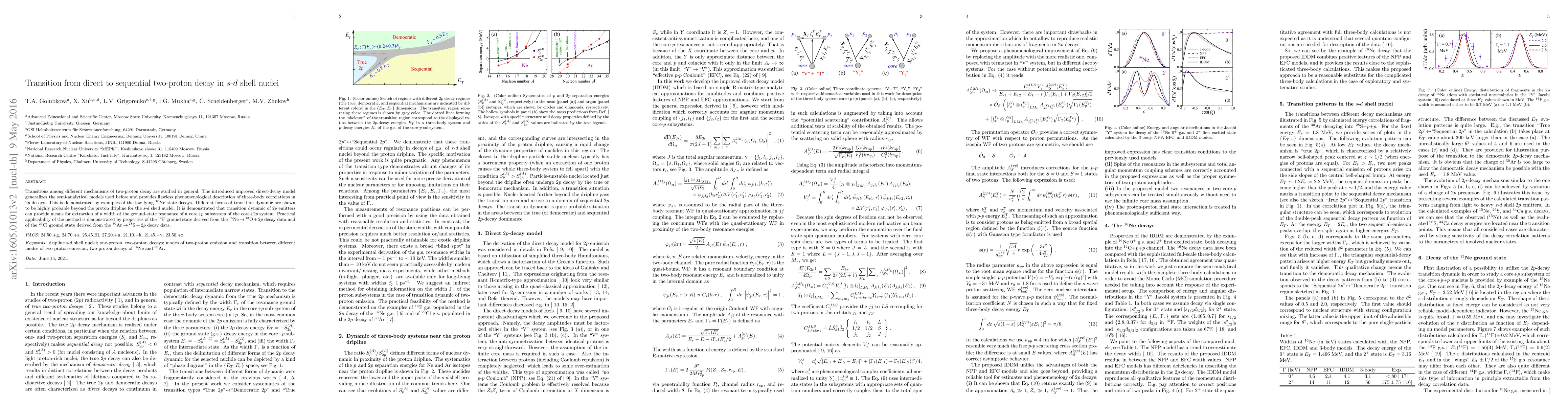 Transitions among different mechanisms of two-proton decay are studied in general. The introduced improved direct-decay model generalizes the semi-analytical models used before and provides flawless phenomenological description of three-body correlations in $2p$ decays. This is demonstrated by examples of the low-lying $^{16}$Ne state decays. Different forms of transition dynamic are shown to be highly probable beyond the proton dripline for the $s$-$d$ shell nuclei. It is demonstrated that transition dynamic of $2p$ emitters can provide means for extraction of a width of the ground-state resonance of a core+$p$ subsystem of the core+$2p$ system. Practical applicability of the method is demonstrated by properties of the $^{14}$F ground state derived from the $^{15}\mbox{Ne}\rightarrow ^{\,13\!\!}\mbox{O}+2p$ decay data and of the $^{29}$Cl ground state derived from the $^{30}\mbox{Ar}\rightarrow ^{\,28\!\!}\mbox{S}+2p$ decay data.