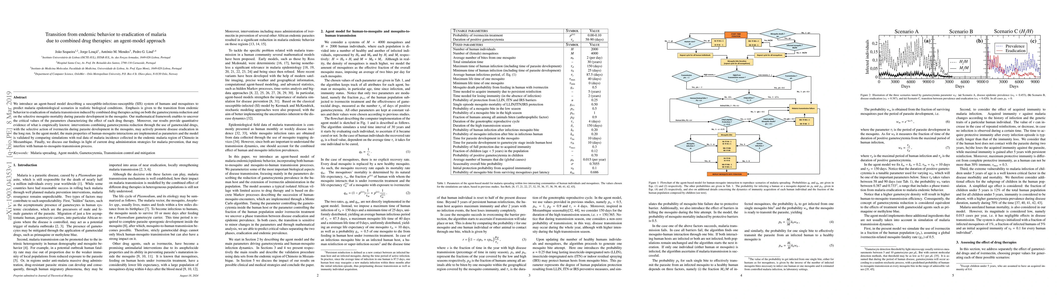 This paper uses an agent-based model to simulate malaria's SIS dynamics and explores the transition from endemic to eradication via combined drug therapies targeting gametocytemia and mosquito mortality. The model reveals critical parameter values for effective interventions and validates its predictions against real data from Mozambique.