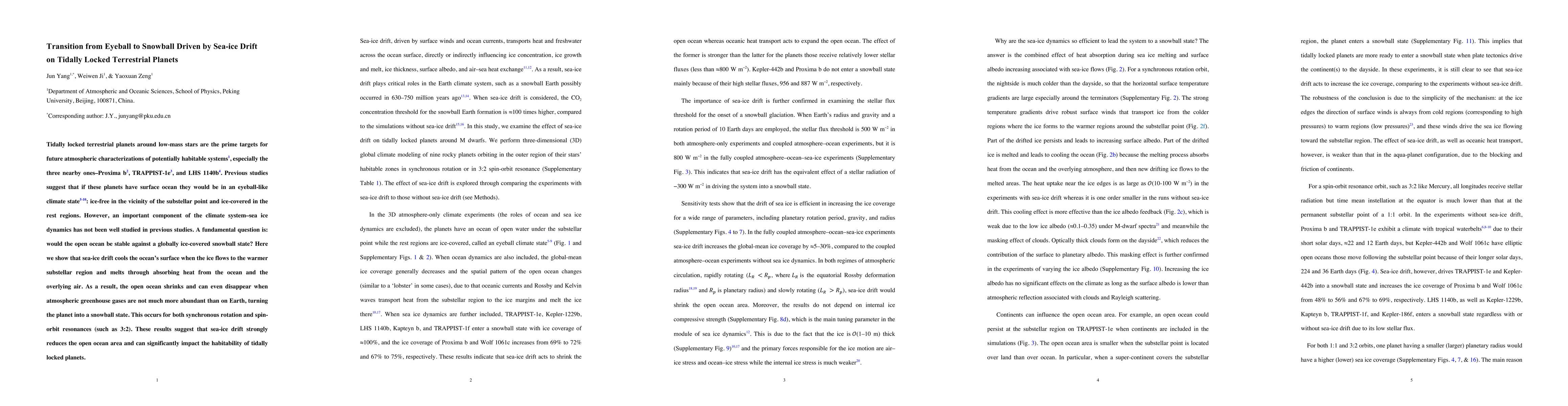 This study examines the potential for sea-ice drift to drive a transition from an "eyeball" state (open ocean near the substellar point) to a "snowball" state on tidally locked terrestrial planets. It finds that sea-ice drift cools the ocean surface, shrinking the open ocean and potentially leading to a globally ice-covered planet, thus significantly impacting habitability.