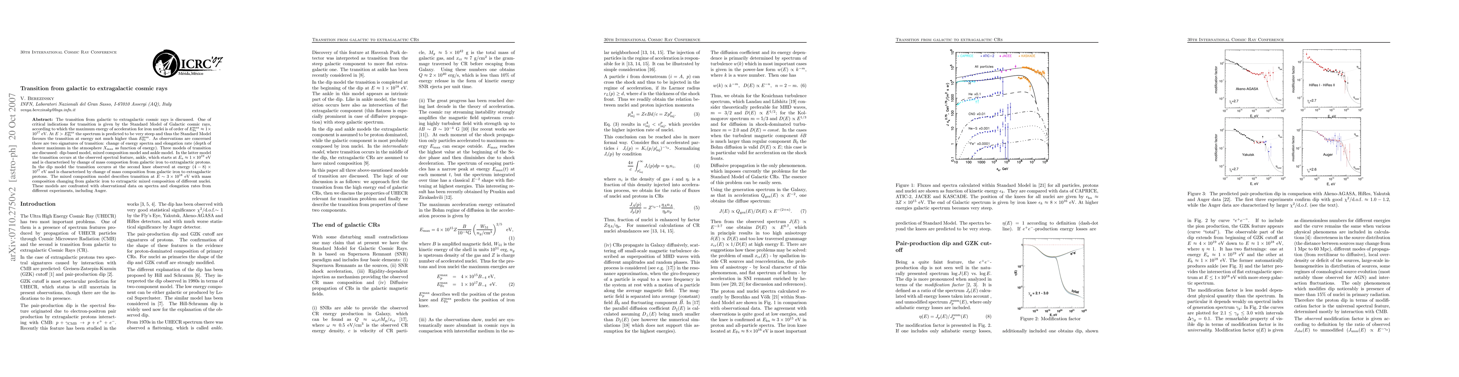 This paper discusses the transition from galactic to extragalactic cosmic rays, focusing on energy spectra and elongation rates as indicators. It explores three models: the dip-based, mixed composition, and ankle models, comparing them to observational data to determine the transition energy and composition change.