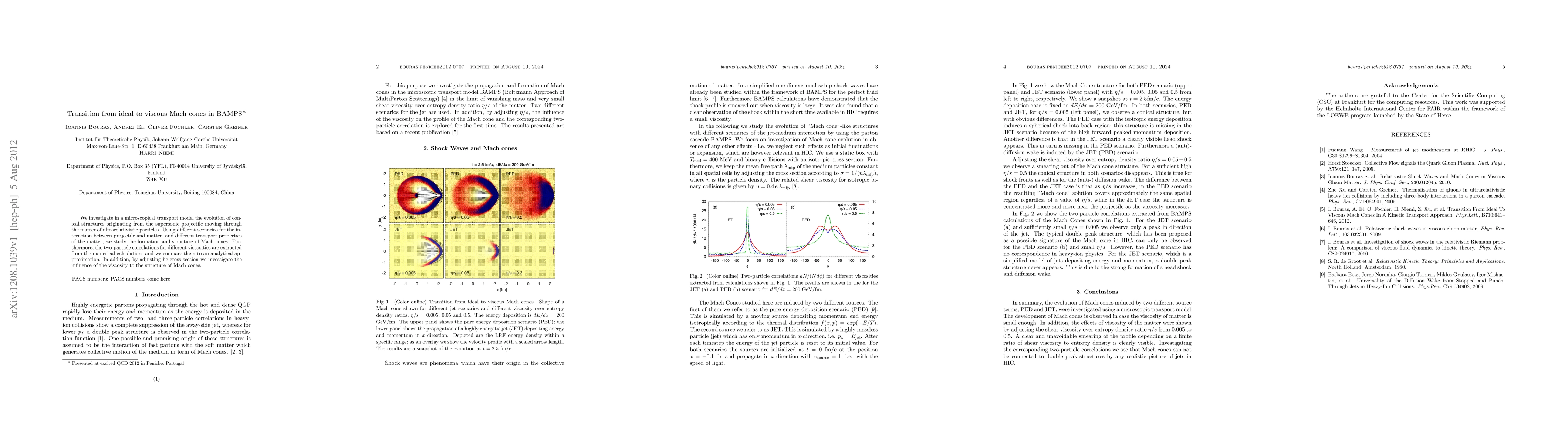 We investigate in a microscopical transport model the evolution of conical structures originating from the supersonic projectile moving through the matter of ultrarelativistic particles. Using different scenarios for the interaction between projectile and matter, and different transport properties of the matter, we study the formation and structure of Mach cones. Furthermore, the two-particle correlations for different viscosities are extracted from the numerical calculations and we compare them to an analytical approximation. In addition, by adjusting he cross section we investigate the influence of the viscosity to the structure of Mach cones.