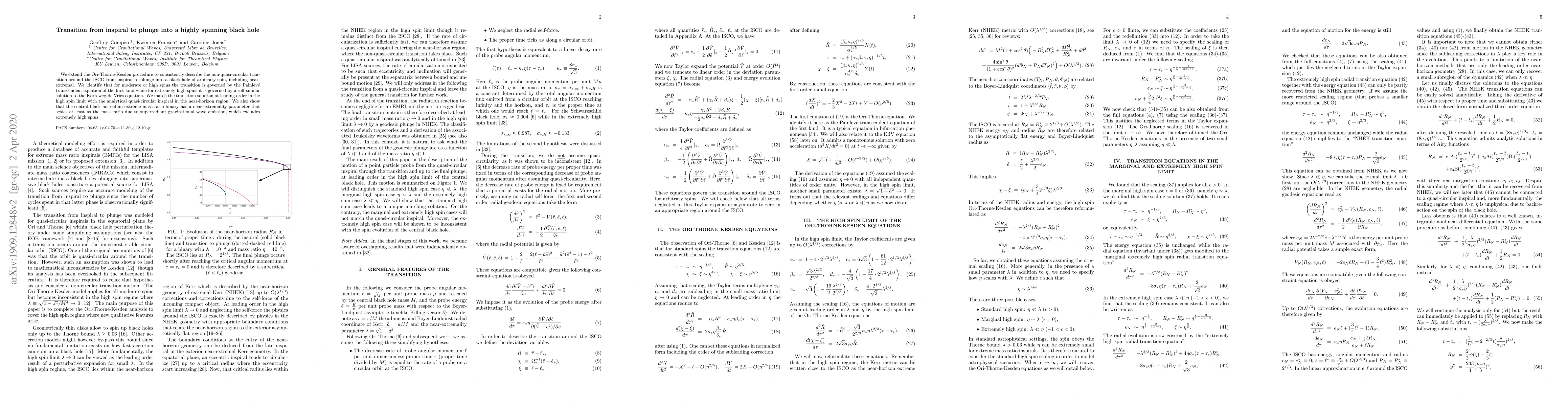 We extend the Ori-Thorne-Kesden procedure to consistently describe the non-quasi-circular transition around the ISCO from inspiral to plunge into a black hole of arbitrary spin, including near-extremal. We identify that for moderate or high spins the transition is governed by the Painlev\'e transcendent equation of the first kind while for extremely high spins it is governed by a self-similar solution to the Korteweg-de Vries equation. We match the transition solution at leading order in the high spin limit with the analytical quasi-circular inspiral in the near-horizon region. We also show that the central black hole of an extreme mass ratio binary has a near-extremality parameter that scales at least as the mass ratio due to superradiant gravitational wave emission, which excludes extremely high spins.