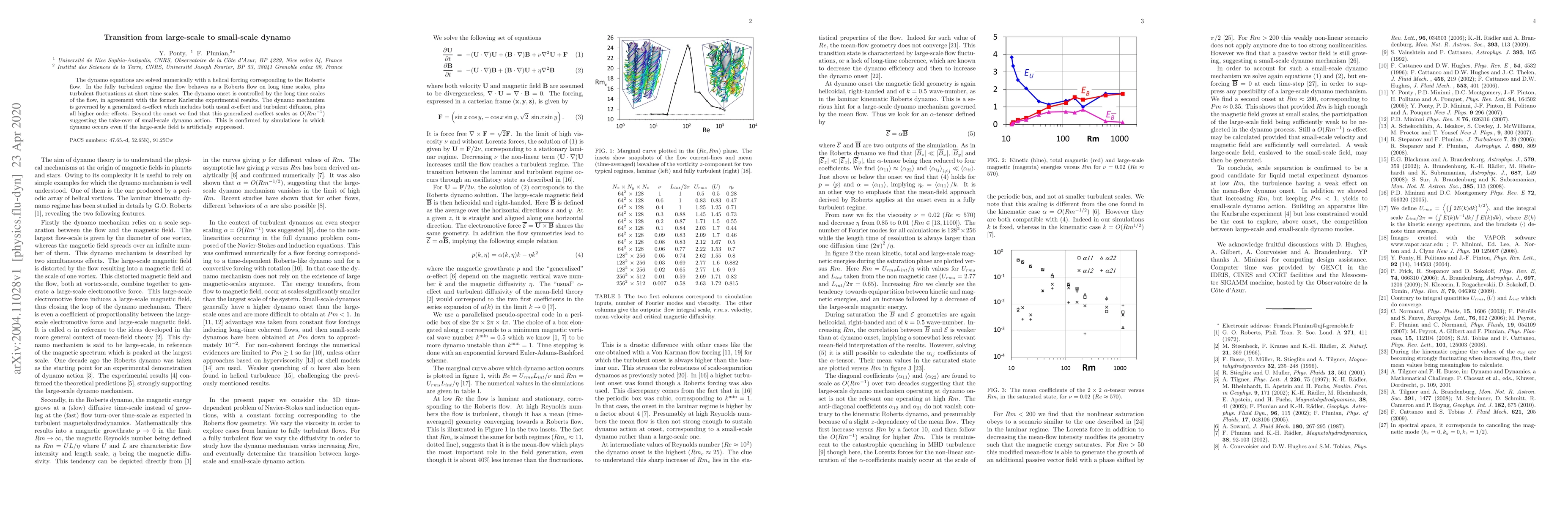 This paper explores the transition from large-scale to small-scale dynamo action through numerical simulations of helical forcing in turbulent flows. The study finds that the dynamo onset is driven by long-time scale Roberts flow dynamics, while small-scale dynamo action emerges as the generalized $\alpha$-effect scales inversely with magnetic Reynolds number.