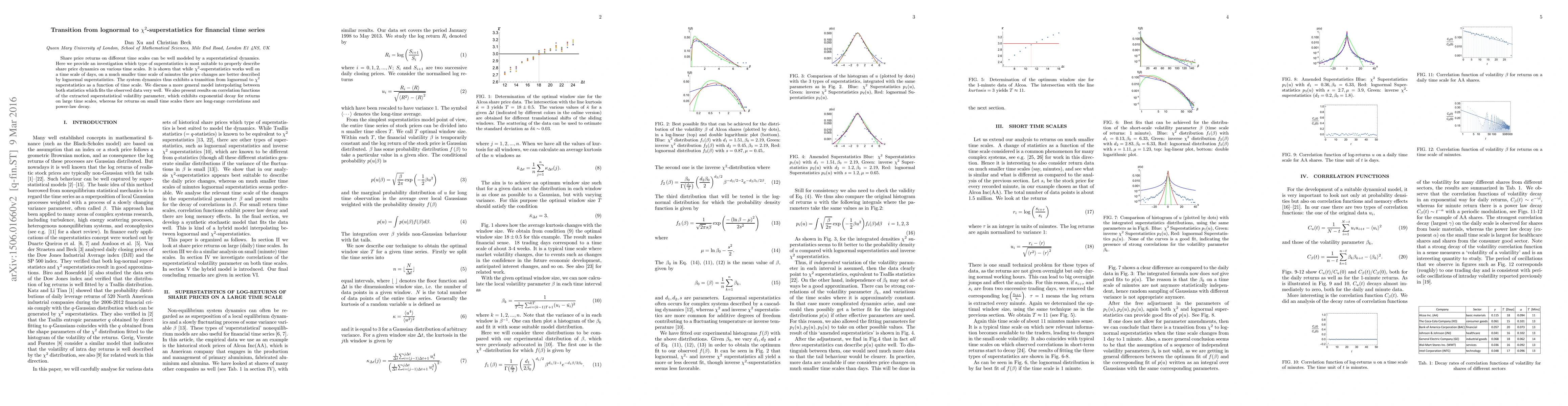 Share price returns on different time scales can be well modelled by a superstatistical dynamics. Here we provide an investigation which type of superstatistics is most suitable to properly describe share price dynamics on various time scales. It is shown that while chi-square superstatistics works well on a time scale of days, on a much smaller time scale of minutes the price changes are better described by lognormal superstatistics. The system dynamics thus exhibits a transition from lognormal to chi-square superstatistics as a function of time scale. We discuss a more general model interpolating between both statistics which fits the observed data very well. We also present results on correlation functions of the extracted superstatistical volatility parameter, which exhibits exponential decay for returns on large time scales, whereas for returns on small time scales there are long-range correlations and power-law decay.