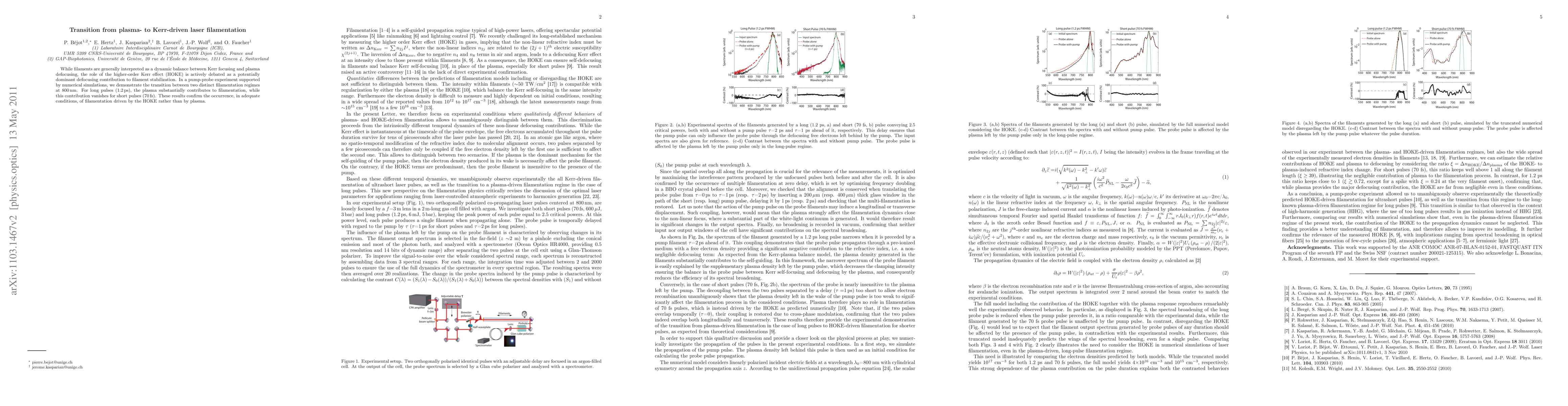 The paper investigates filamentation regimes at 800 nm, showing that long pulses (1.2 ps) rely on plasma for filamentation, while short pulses (70 fs) transition to a Kerr effect-driven regime, highlighting the dominance of higher-order Kerr effect over plasma defocusing.