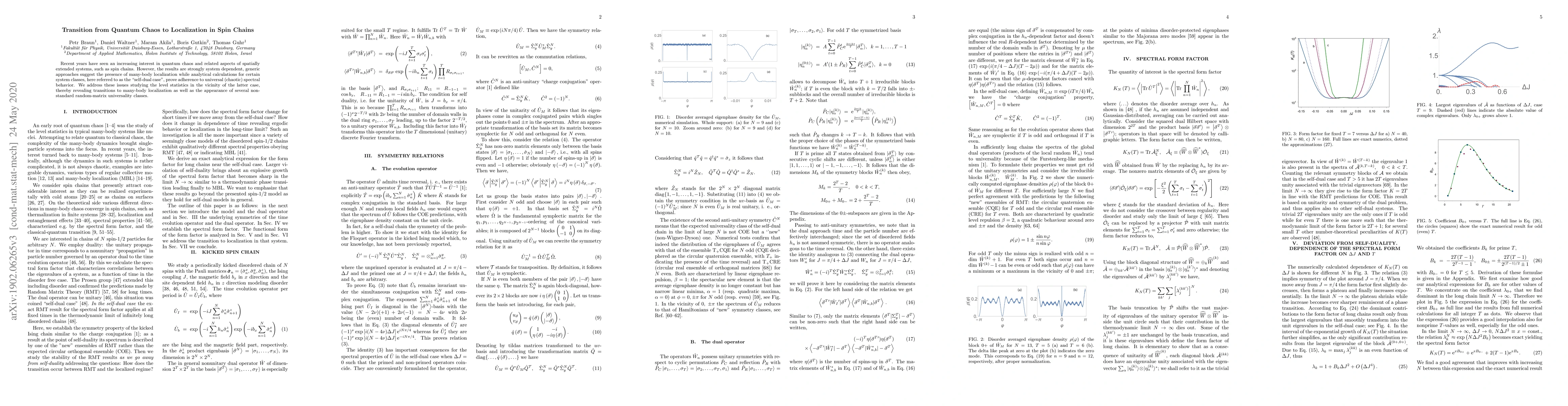 Recent years have seen an increasing interest in quantum chaos and related aspects of spatially extended systems, such as spin chains. However, the results are strongly system dependent, generic approaches suggest the presence of many-body localization while analytical calculations for certain system classes, here referred to as the ``self-dual case'', prove adherence to universal (chaotic) spectral behavior. We address these issues studying the level statistics in the vicinity of the latter case, thereby revealing transitions to many-body localization as well as the appearance of several non-standard random-matrix universality classes.