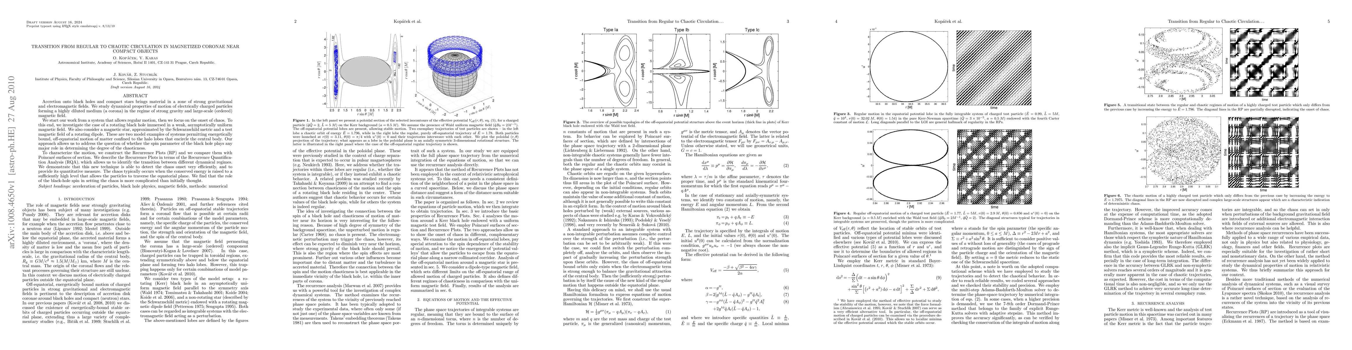Accretion onto black holes and compact stars brings material in a zone of strong gravitational and electromagnetic fields. We study dynamical properties of motion of electrically charged particles forming a highly diluted medium (a corona) in the regime of strong gravity and large-scale (ordered) magnetic field. We start our work from a system that allows regular motion, then we focus on the onset of chaos. To this end, we investigate the case of a rotating black hole immersed in a weak, asymptotically uniform magnetic field. We also consider a magnetic star, approximated by the Schwarzschild metric and a test magnetic field of a rotating dipole. These are two model examples of systems permitting energetically bound, off-equatorial motion of matter confined to the halo lobes that encircle the central body. Our approach allows us to address the question of whether the spin parameter of the black hole plays any major role in determining the degree of the chaoticness. To characterize the motion, we construct the Recurrence Plots (RP) and we compare them with Poincar\'e surfaces of section. We describe the Recurrence Plots in terms of the Recurrence Quantification Analysis (RQA), which allows us to identify the transition between different dynamical regimes. We demonstrate that this new technique is able to detect the chaos onset very efficiently, and to provide its quantitative measure. The chaos typically occurs when the conserved energy is raised to a sufficiently high level that allows the particles to traverse the equatorial plane. We find that the role of the black-hole spin in setting the chaos is more complicated than initially thought.