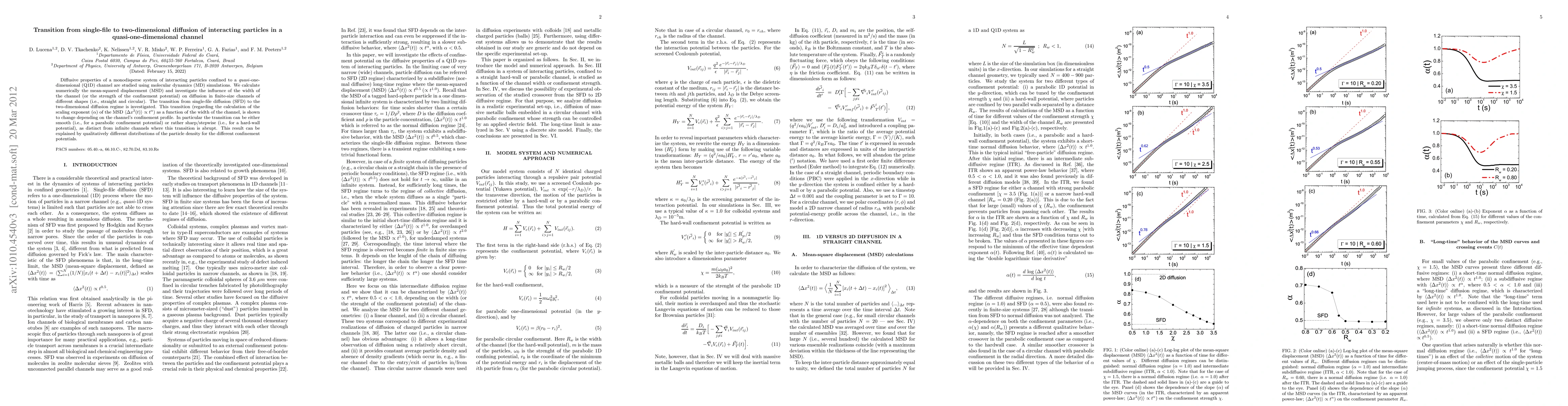 This study uses molecular dynamics simulations to explore the diffusion of interacting particles in quasi-one-dimensional channels, revealing a transition from single-file to two-dimensional diffusion influenced by channel width and shape. The transition's nature varies depending on the confinement potential, showing smooth or sharp changes in diffusion scaling.