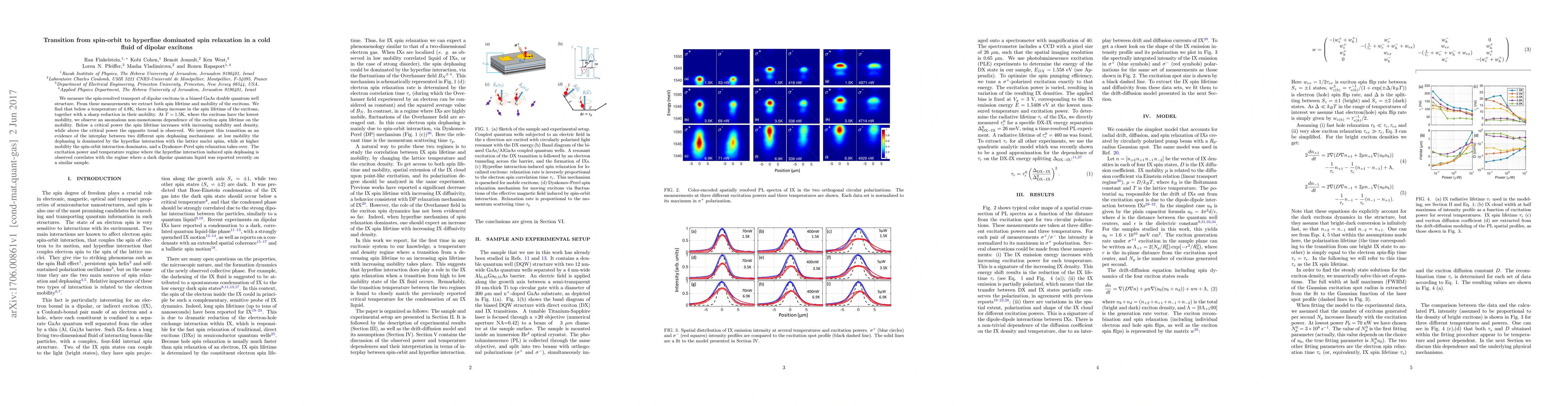 We measure the spin-resolved transport of dipolar excitons in a biased GaAs double quantum well structure. From these measurements we extract both spin lifetime and mobility of the excitons. We find that below a temperature of $4.8$K, there is a sharp increase in the spin lifetime of the excitons, together with a sharp reduction in their mobility. Below a critical power the spin lifetime increases with increasing mobility and density, while above the critical power the opposite trend is observed. We interpret this transition as an evidence of the interplay between two different spin dephasing mechanisms: at low mobility the dephasing is dominated by the hyperfine interaction with the lattice nuclei spins, while at higher mobility the spin-orbit interaction dominates, and a Dyakonov-Perel spin relaxation takes over. The excitation power and temperature regime where the hyperfine interaction induced spin dephasing is observed correlates with the regime where a dark dipolar quantum liquid was reported recently on a similar sample.
