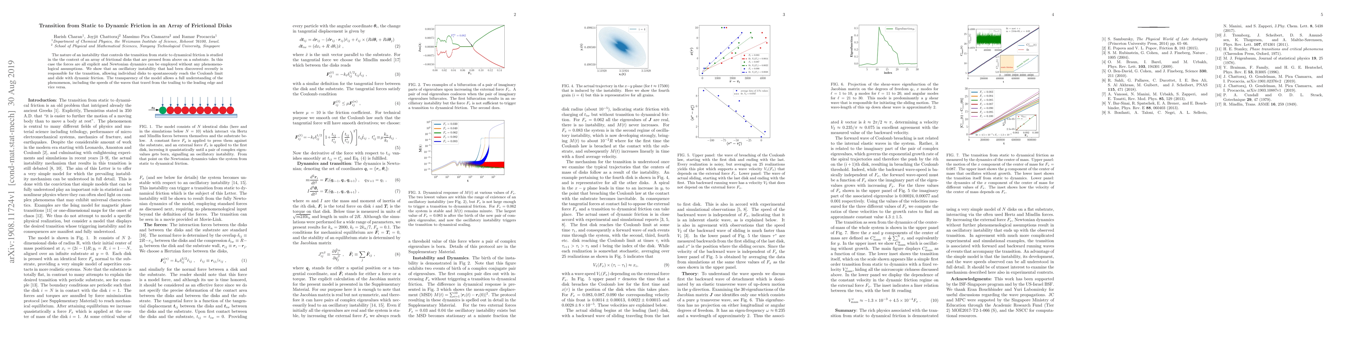 The nature of an instability that controls the transition from static to dynamical friction is studied in the the context of an array of frictional disks that are pressed from above on a substrate. In this case the forces are all explicit and Newtonian dynamics can be employed without any phenomenological assumptions. We show that an oscillatory instability that had been discovered recently is responsible for the transition, allowing individual disks to spontaneously reach the Coulomb limit and slide with dynamic friction. The transparency of the model allows a full understanding of the phenomenon, including the speeds of the waves that travel from the trailing to the leading edge and vice versa.