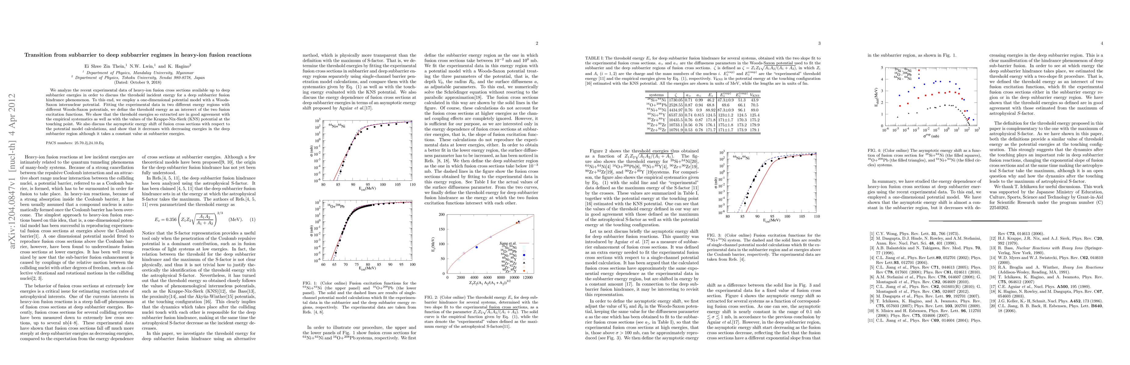 This paper analyzes heavy-ion fusion cross sections up to deep subbarrier energies to determine the threshold energy for fusion hindrance. Using a Woods-Saxon potential model, the authors find threshold energies that align well with empirical data and the KNS potential, and observe a decreasing asymptotic energy shift in deep subbarrier regions.