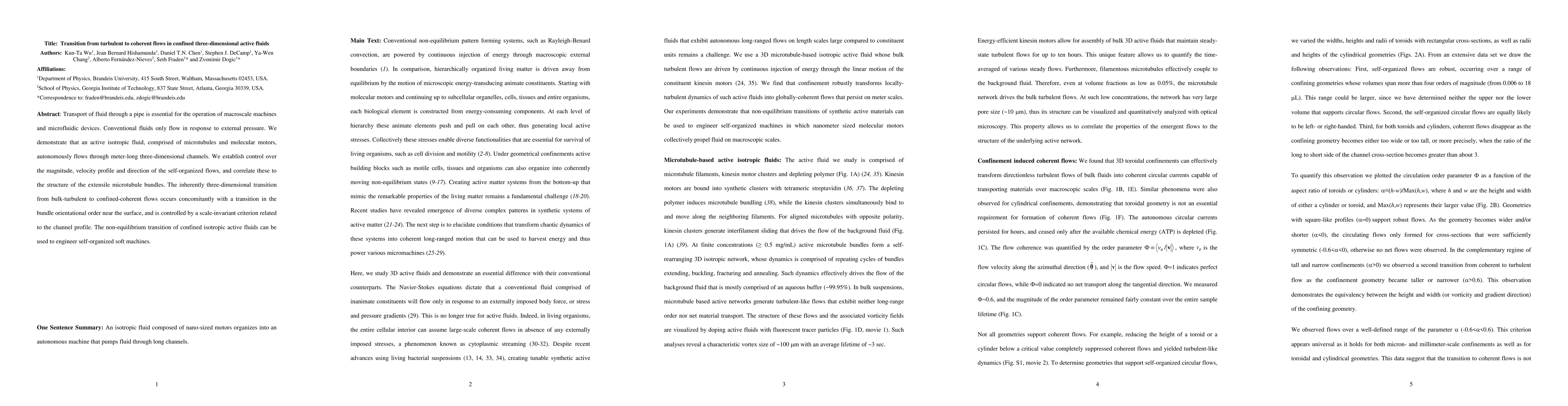 This paper investigates the autonomous flow of active isotropic fluids through three-dimensional channels, demonstrating control over flow characteristics linked to microtubule bundle structures. The transition from turbulent to coherent flows is governed by a scale-invariant criterion related to channel geometry, enabling the design of self-organized soft machines.