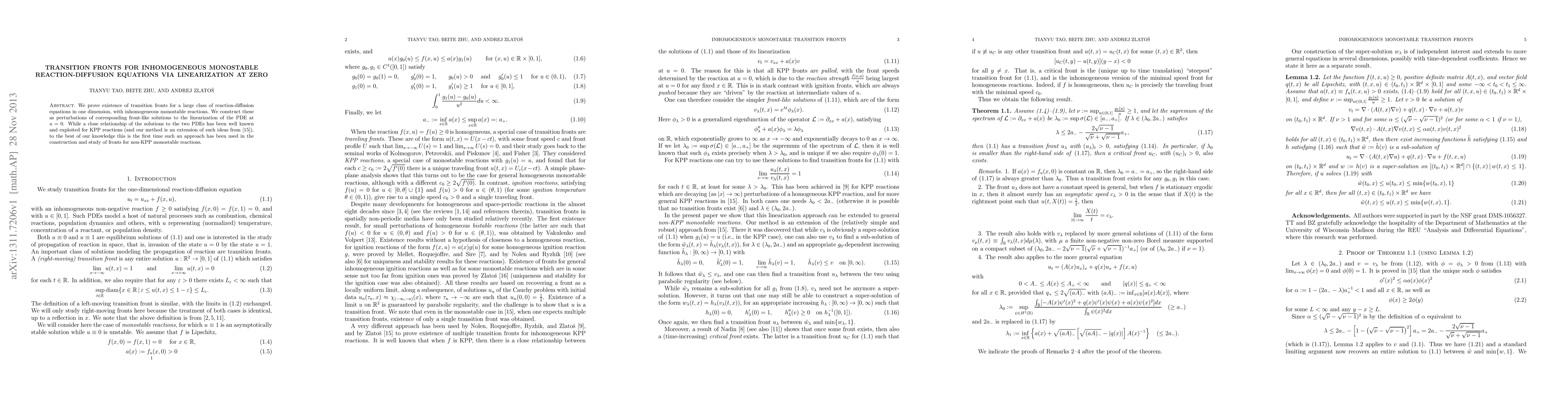 This paper proves the existence of transition fronts for inhomogeneous monostable reaction-diffusion equations in one dimension, constructing them as perturbations of front-like solutions from linearizing the PDE at zero. This method extends known techniques for KPP reactions to non-KPP monostable reactions for the first time.