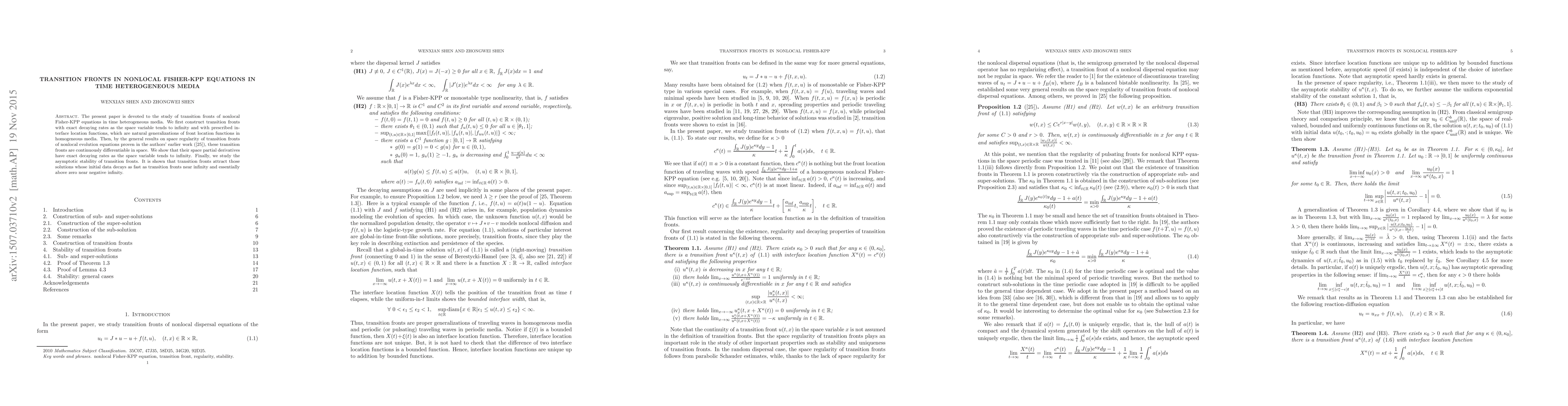 The present paper is devoted to the study of transition fronts of nonlocal Fisher-KPP equations in time heterogeneous media. We first construct transition fronts with prescribed interface location functions, which are natural generalizations of front location functions in homogeneous media. It it shown that these transition fronts have exact decaying rates as the space variable tends to infinity. Then, by the general results on space regularity of transition fronts of nonlocal evolution equations proven in the authors' earlier work (\cite{ShSh14-4}), these transition fronts are continuously differentiable in space. We show that their space partial derivatives have exact decaying rates as the space variable tends to infinity. Finally, we study the asymptotic stability of transition fronts. It is shown that transition fronts attract those solutions whose initial data decays as fast as transition fronts near infinity and essentially above zero near negative infinity.