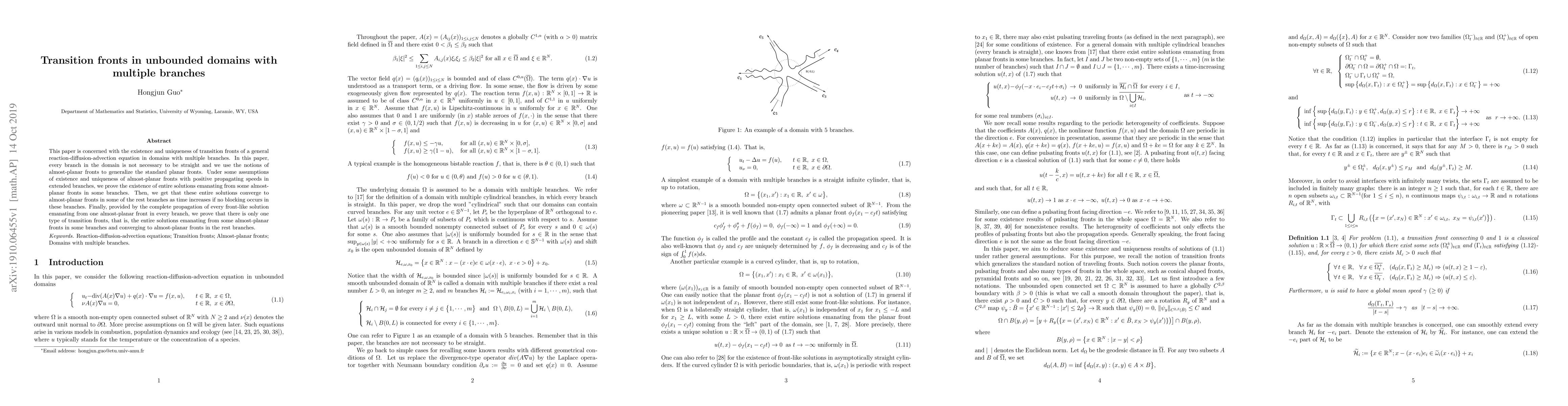 This paper is concerned with the existence and uniqueness of transition fronts of a general reaction-diffusion-advection equation in domains with multiple branches. In this paper, every branch in the domain is not necessary to be straight and we use the notions of almost-planar fronts to generalize the standard planar fronts. Under some assumptions of existence and uniqueness of almost-planar fronts with positive propagating speeds in extended branches, we prove the existence of entire solutions emanating from some almost-planar fronts in some branches. Then, we get that these entire solutions converge to almost-planar fronts in some of the rest branches as time increases if no blocking occurs in these branches. Finally, provided by the complete propagation of every front-like solution emanating from one almost-planar front in every branch, we prove that there is only one type of transition fronts, that is, the entire solutions emanating from some almost-planar fronts in some branches and converging to almost-planar fronts in the rest branches.