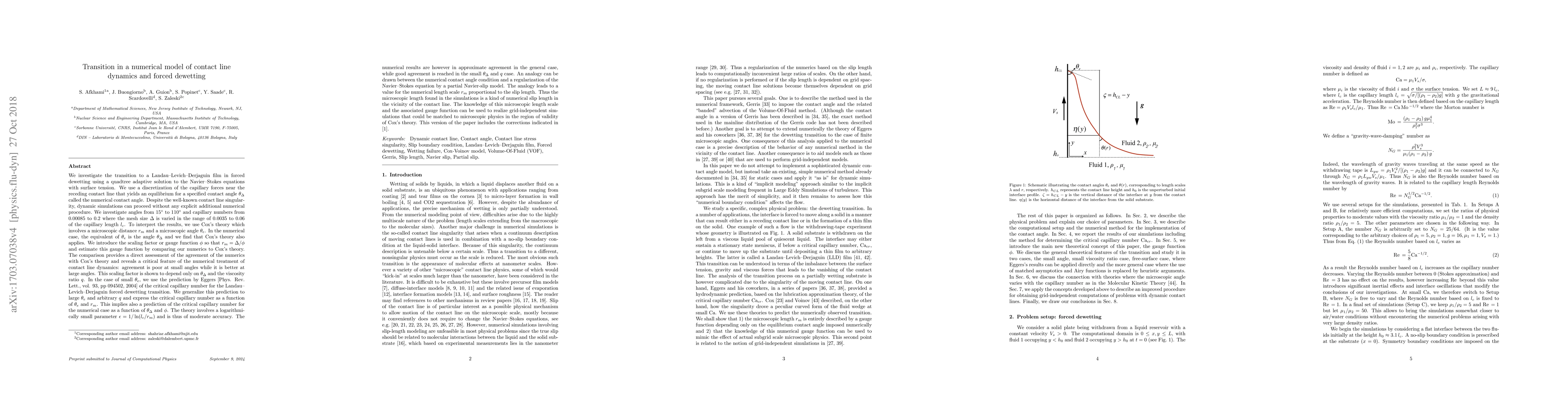 We investigate the transition to a Landau-Levich-Derjaguin film in forced dewetting using a quadtree adaptive solution to the Navier-Stokes equations with surface tension. We use a discretization of the capillary forces near the receding contact line that yields an equilibrium for a specified contact angle $\theta_\Delta$ called the numerical contact angle. Despite the well-known contact line singularity, dynamic simulations can proceed without any explicit additional numerical procedure. We investigate angles from $15^\circ$ to $110^\circ$ and capillary numbers from $0.00085$ to $0.2$ where the mesh size $\Delta$ is varied in the range of $0.0035$ to $0.06$ of the capillary length $l_c$. To interpret the results, we use Cox's theory which involves a microscopic distance $r_m$ and a microscopic angle $\theta_e$. In the numerical case, the equivalent of $\theta_e$ is the angle $\theta_\Delta$ and we find that Cox's theory also applies. We introduce the scaling factor or gauge function $\phi$ so that $r_m = \Delta/\phi$ and estimate this gauge function by comparing our numerics to Cox's theory. The comparison provides a direct assessment of the agreement of the numerics with Cox's theory and reveals a critical feature of the numerical treatment of contact line dynamics: agreement is poor at small angles while it is better at large angles. This scaling factor is shown to depend only on $\theta_\Delta$ and the viscosity ratio $q$. In the case of small $\theta_e$, we use the prediction by Eggers [Phys. Rev. Lett., vol. 93, pp 094502, 2004] of the critical capillary number for the Landau-Levich-Derjaguin forced dewetting transition. We generalize this prediction to large $\theta_e$ and arbitrary $q$ and express the critical capillary number as a function of $\theta_e$ and $r_m$. An analogy can be drawn between $r_m$ and the numerical slip length.