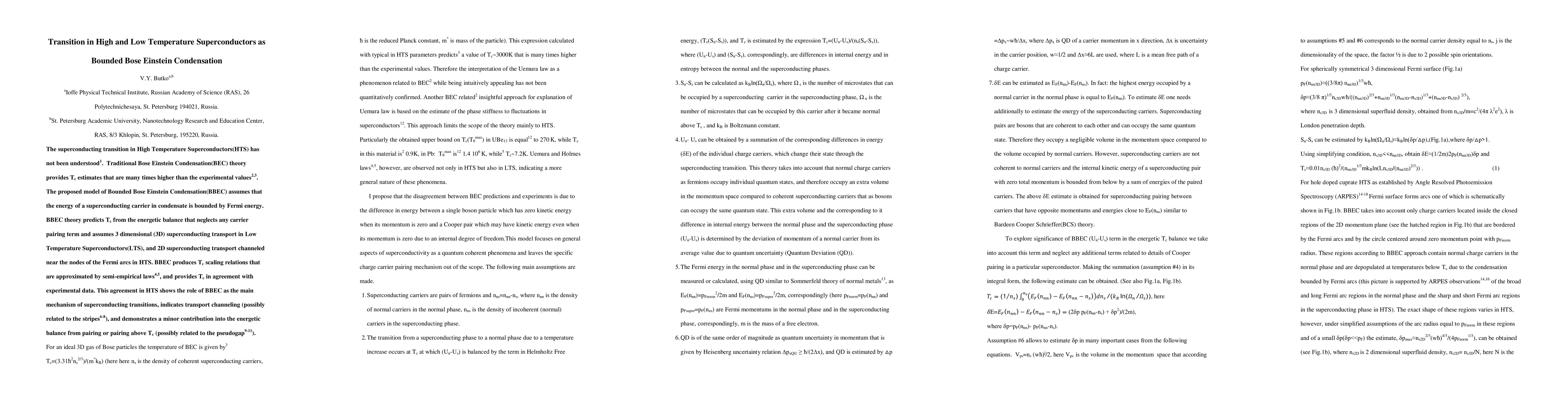This paper proposes a Bounded Bose Einstein Condensation (BBEC) model to explain the superconducting transition in High Temperature Superconductors (HTS), suggesting that Tc is determined by energetic balance without carrier pairing. BBEC aligns Tc predictions with experimental data, indicating transport channeling near Fermi arcs and minimal pairing contribution.