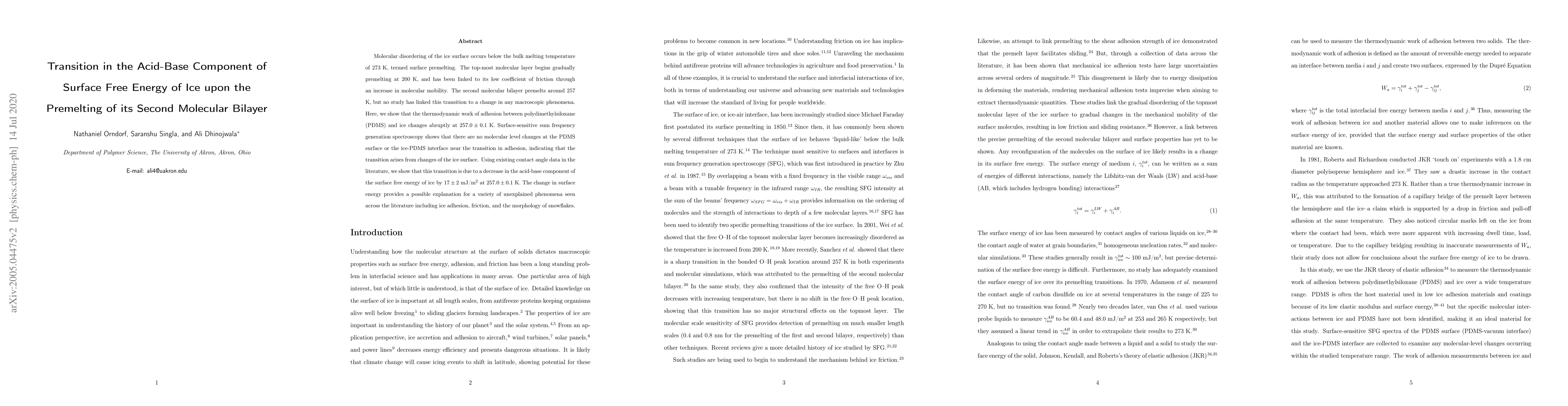 The surface premelting of ice's second molecular bilayer causes a sudden decrease in its acid-base component of surface free energy, explained by changes in the ice surface at 257 K.