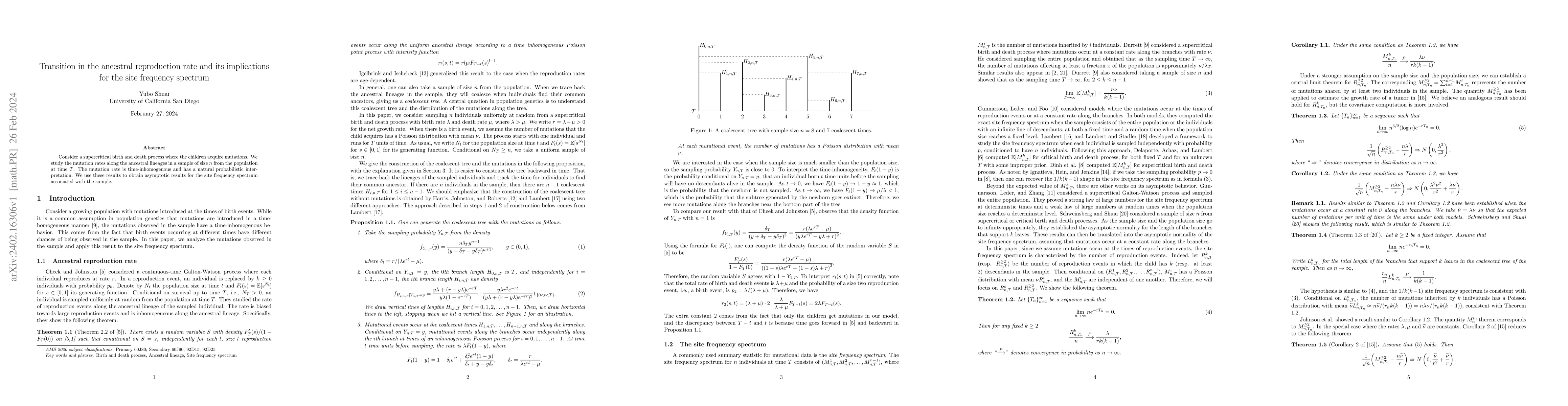 This paper investigates the mutation rates along ancestral lineages in a supercritical birth-death process with time-varying mutation rates, providing probabilistic insights. It derives asymptotic results for the site frequency spectrum in samples from the population, highlighting the implications of changes in the ancestral reproduction rate.