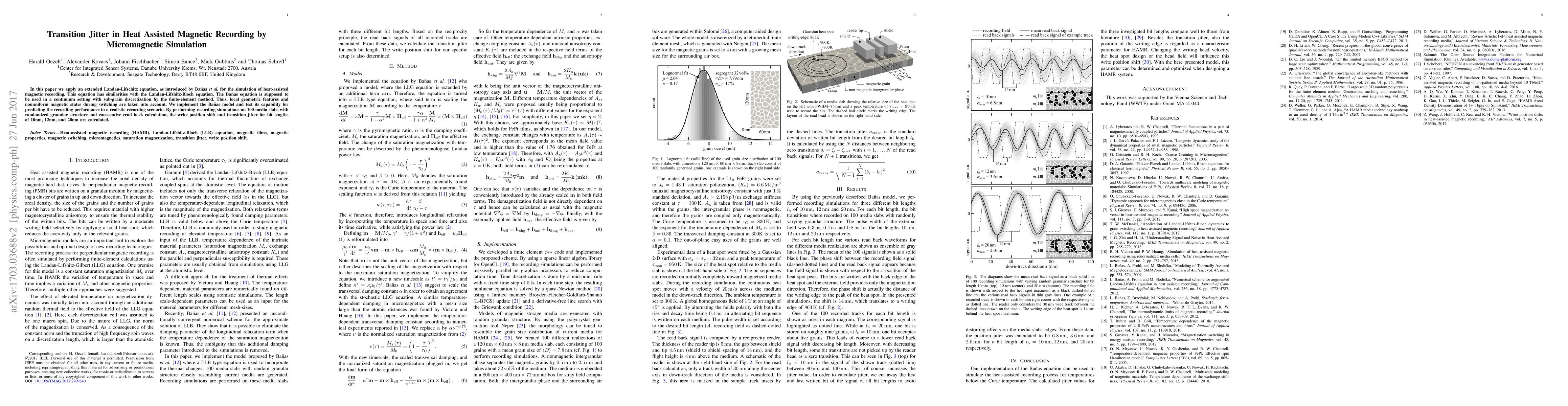This paper uses an extended Landau-Lifschitz equation to simulate heat-assisted magnetic recording, focusing on the prediction of transition jitter and write position shift in media with varying bit lengths. The Baňas model is implemented to account for local geometric features and nonuniform magnetic states during switching.