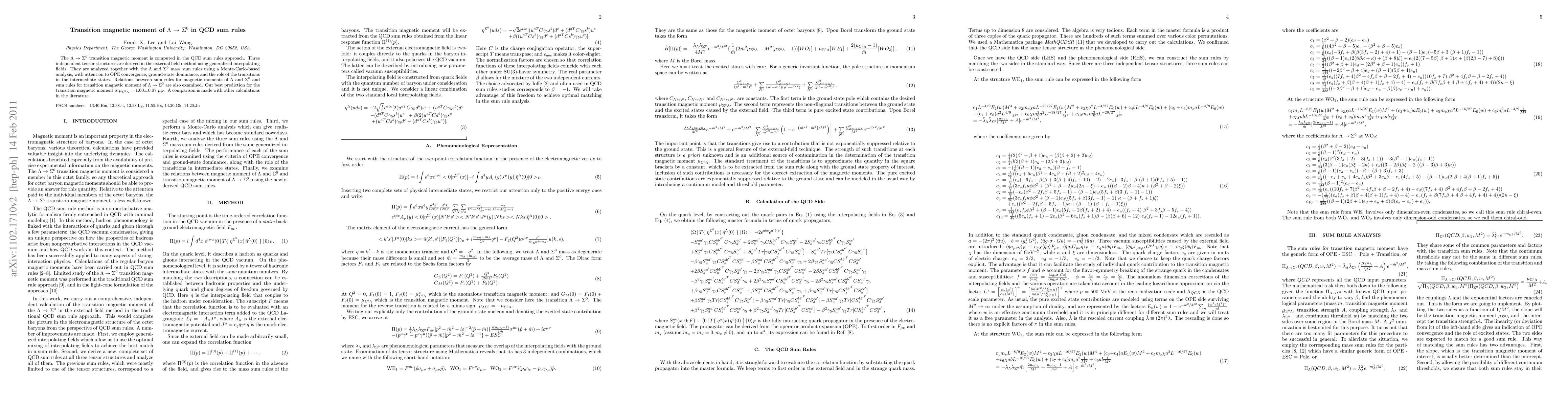 This paper computes the $\Lambda$ $\to$ $\Sigma^0$ transition magnetic moment using QCD sum rules, deriving three tensor structures and analyzing them with Monte-Carlo methods. The best prediction is $\mu_{\Sigma^0\Lambda}= 1.60\pm 0.07\; \mu_N$, with a comparison to other theoretical calculations.