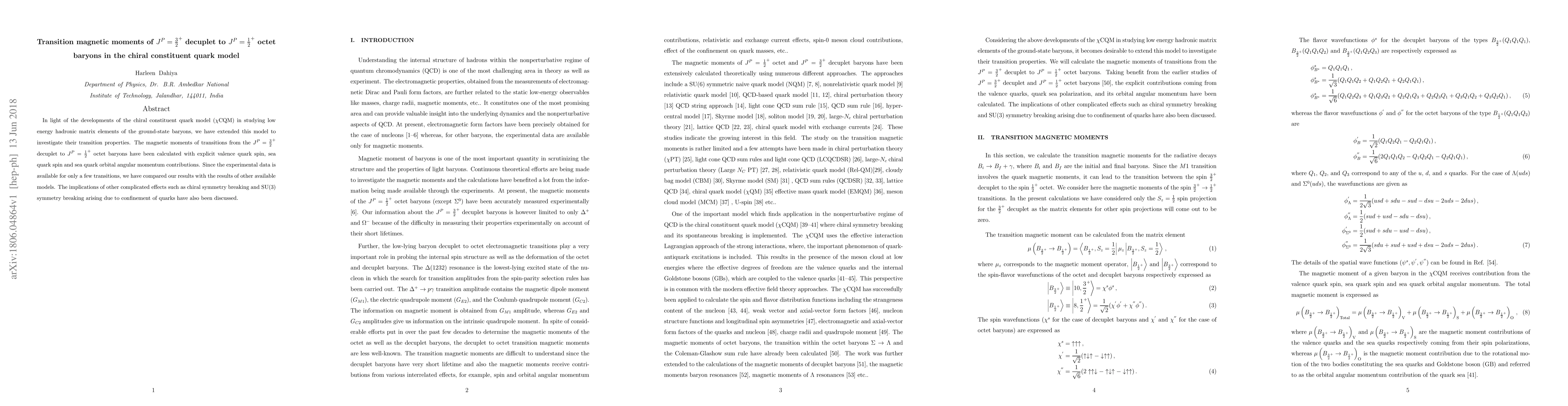This paper extends the chiral constituent quark model to calculate magnetic moments for transitions from $J^P=\frac{3}{2}^+$ decuplet to $J^P=\frac{1}{2}^+$ octet baryons, considering quark spin and orbital contributions. Comparisons with other models and implications of chiral symmetry breaking are discussed.