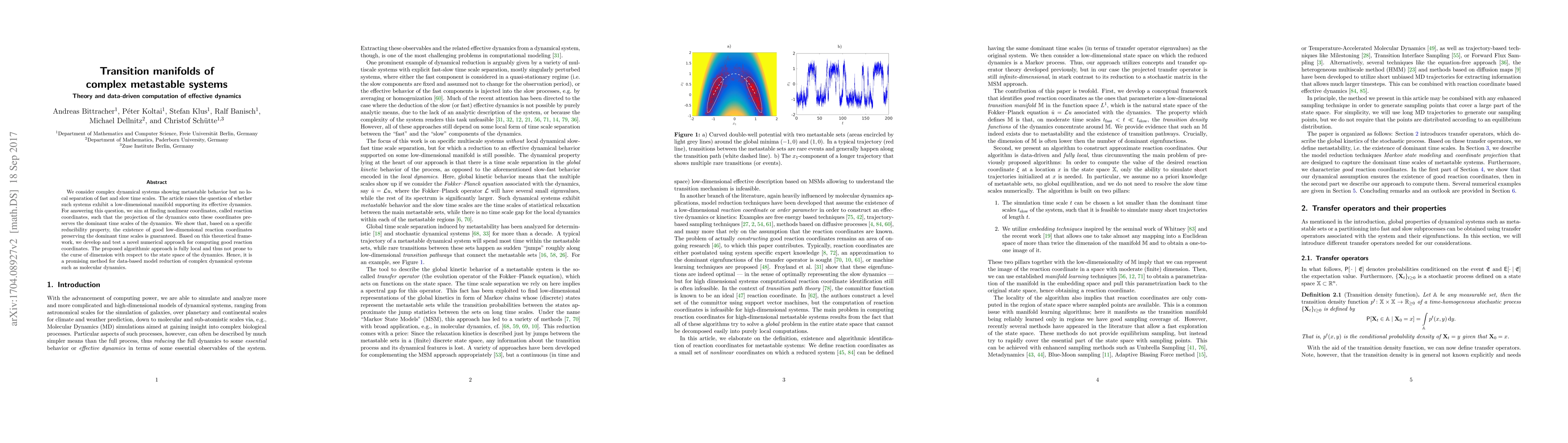 This paper explores the existence of low-dimensional manifolds in complex metastable dynamical systems without clear fast-slow separations. It proposes a theoretical framework for identifying reaction coordinates that preserve dominant time scales, and introduces a novel local numerical method for computing these coordinates, demonstrating its potential for data-driven model reduction in systems like molecular dynamics.