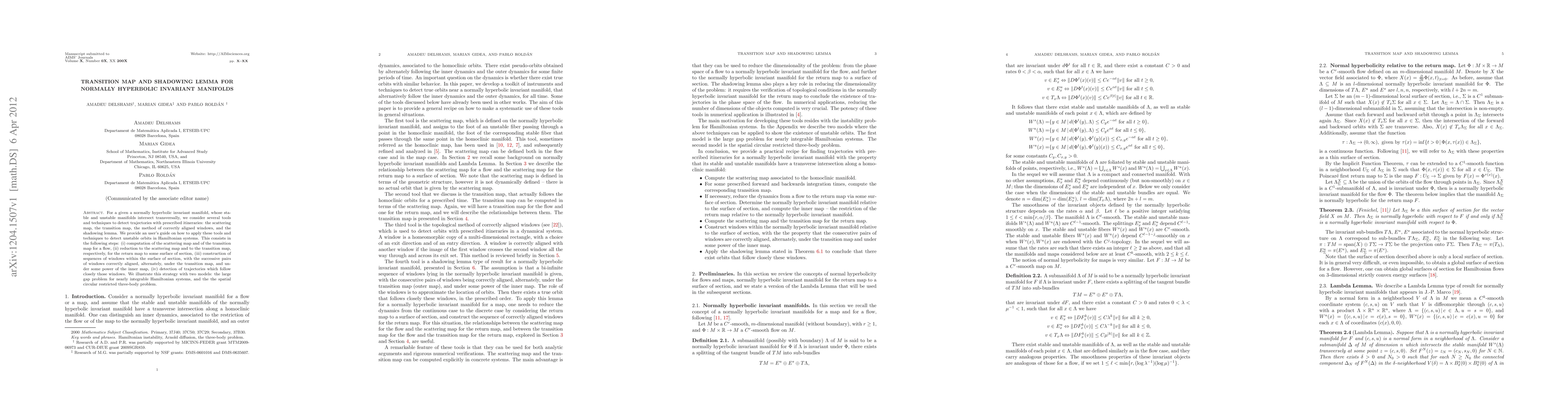 For a given a normally hyperbolic invariant manifold, whose stable and unstable manifolds intersect transversally, we consider several tools and techniques to detect trajectories with prescribed itineraries: the scattering map, the transition map, the method of correctly aligned windows, and the shadowing lemma. We provide an user's guide on how to apply these tools and techniques to detect unstable orbits in Hamiltonian systems. This consists in the following steps: (i) computation of the scattering map and of the transition map for a flow, (ii) reduction to the scattering map and to the transition map, respectively, for the return map to some surface of section, (iii) construction of sequences of windows within the surface of section, with the successive pairs of windows correctly aligned, alternately, under the transition map, and under some power of the inner map, (iv) detection of trajectories which follow closely those windows. We illustrate this strategy with two models: the large gap problem for nearly integrable Hamiltonian systems, and the the spatial circular restricted three-body problem.