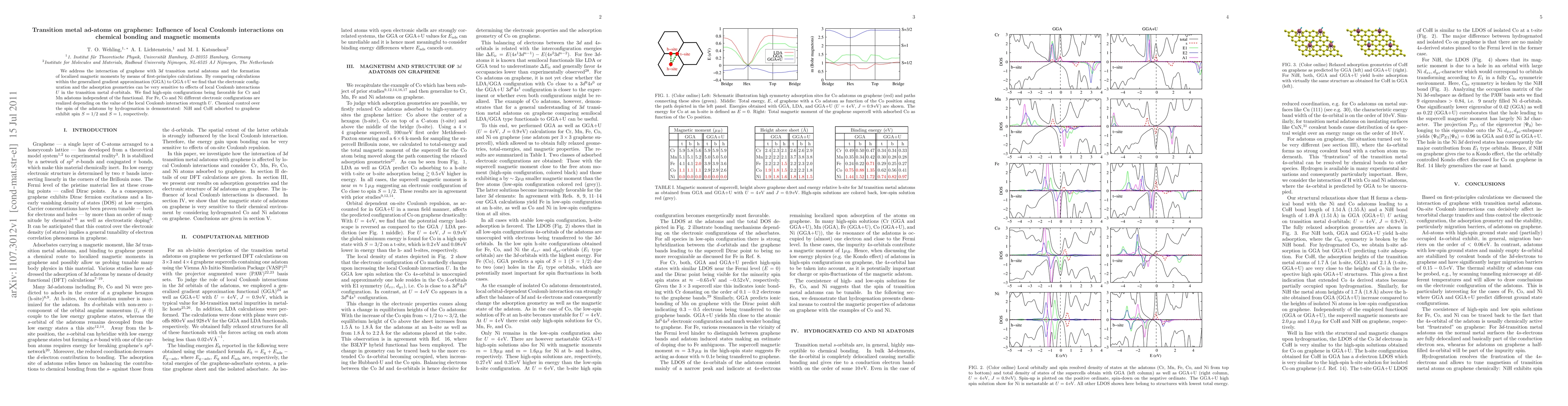 This paper investigates the interaction of 3d transition metal adatoms with graphene, revealing that local Coulomb interactions significantly influence electronic configurations and adsorption geometries. High-spin configurations are favorable for Cr and Mn, while Fe, Co, and Ni exhibit varied configurations based on Coulomb interaction strength U, with hydrogenation demonstrating chemical control over adatom spin states.