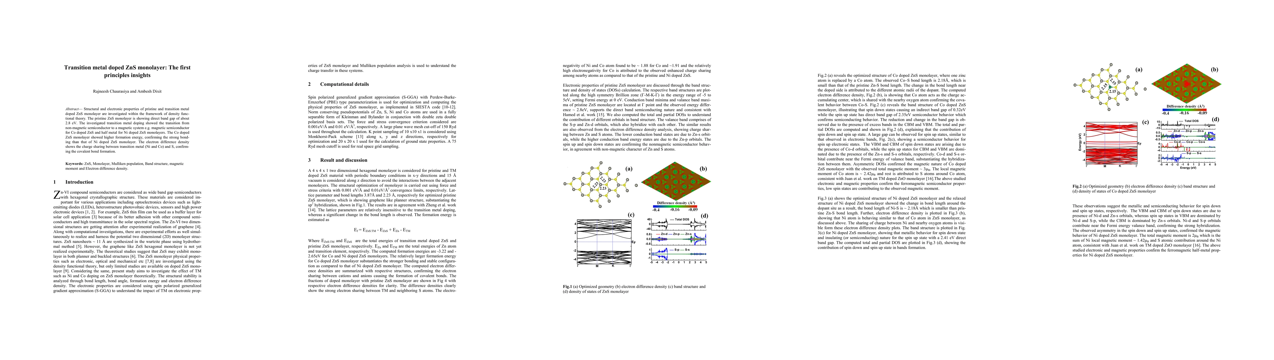 This study investigates the structural and electronic properties of pristine and transition metal-doped ZnS monolayers using density functional theory. Transition metal doping transforms ZnS from a non-magnetic semiconductor to magnetic systems, with Co doping creating a magnetic semiconductor and Ni doping resulting in a half-metal.
