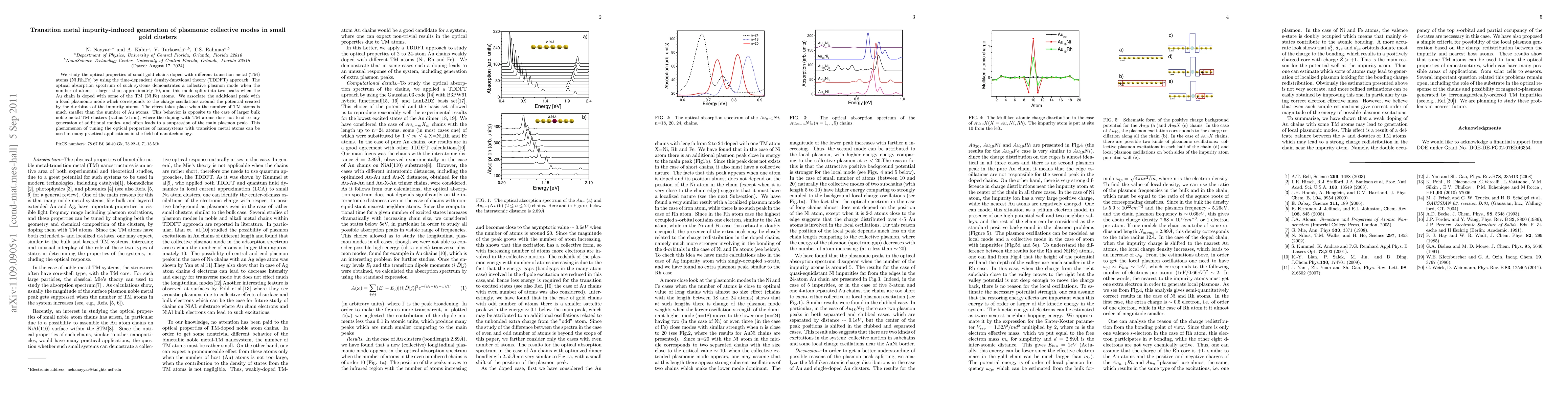 This study investigates the optical properties of small gold chains doped with transition metals (Ni, Rh, Fe) using TDDFT, revealing a collective plasmon mode that splits into two peaks when doped with Ni or Fe. This local plasmonic mode arises from charge oscillations around the impurity atoms' d-orbitals, demonstrating a unique behavior in small clusters compared to larger bulk noble-metal-TM clusters.