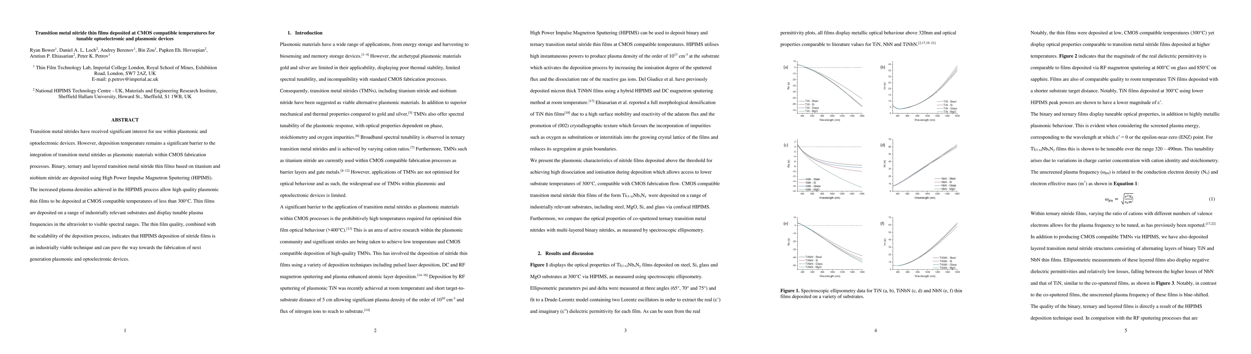 This paper explores the use of High Power Impulse Magnetron Sputtering (HIPIMS) to deposit high-quality transition metal nitride thin films at CMOS-compatible temperatures below 300°C, enabling their integration into next-generation plasmonic and optoelectronic devices. The deposited films show tunable plasma frequencies across the ultraviolet to visible spectrum, indicating their potential for advanced device applications.
