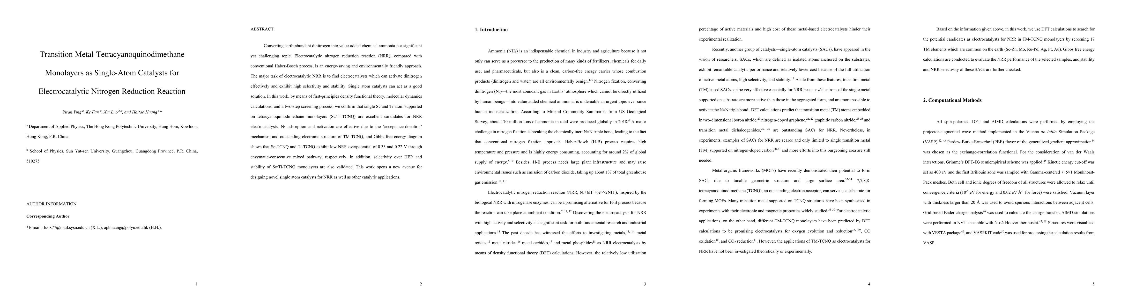 This paper identifies single Sc and Ti atoms supported on tetracyanoquinodimethane monolayers as effective electrocatalysts for the nitrogen reduction reaction, demonstrating low overpotentials and high selectivity, validated through theoretical calculations and a two-step screening process. The study highlights a promising approach for designing novel single-atom catalysts for sustainable nitrogen reduction.