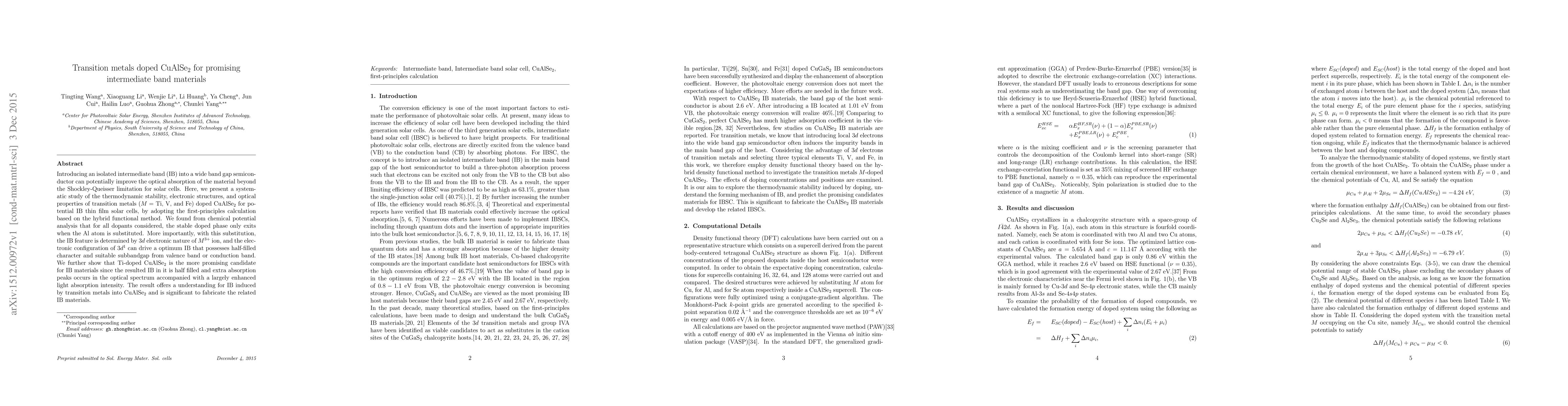 Introducing an isolated intermediate band (IB) into a wide band gap semiconductor can potentially improve the optical absorption of the material beyond the Shockley-Queisser limitation for solar cells. Here, we present a systematic study of the thermodynamic stability, electronic structures, and optical properties of transition metals (M = Ti, V, and Fe) doped CuAlSe2 for potential IB thin film solar cells, by adopting the first-principles calculation based on the hybrid functional method. We found from chemical potential analysis that for all dopants considered, the stable doped phase only exits when the Al atom is substituted. More importantly, with this substitution, the IB feature is determined by $3d$ electronic nature of M^{3+} ion, and the electronic configuration of 3d^1 can drive a optimum IB that possesses half-filled character and suitable subbandgap from valence band or conduction band. We further show that Ti-doped CuAlSe2 is the more promising candidate for IB materials since the resulted IB in it is half filled and extra absorption peaks occurs in the optical spectrum accompanied with a largely enhanced light absorption intensity. The result offers a understanding for IB induced by transition metals into CuAlSe2 and is significant to fabricate the related IB materials.