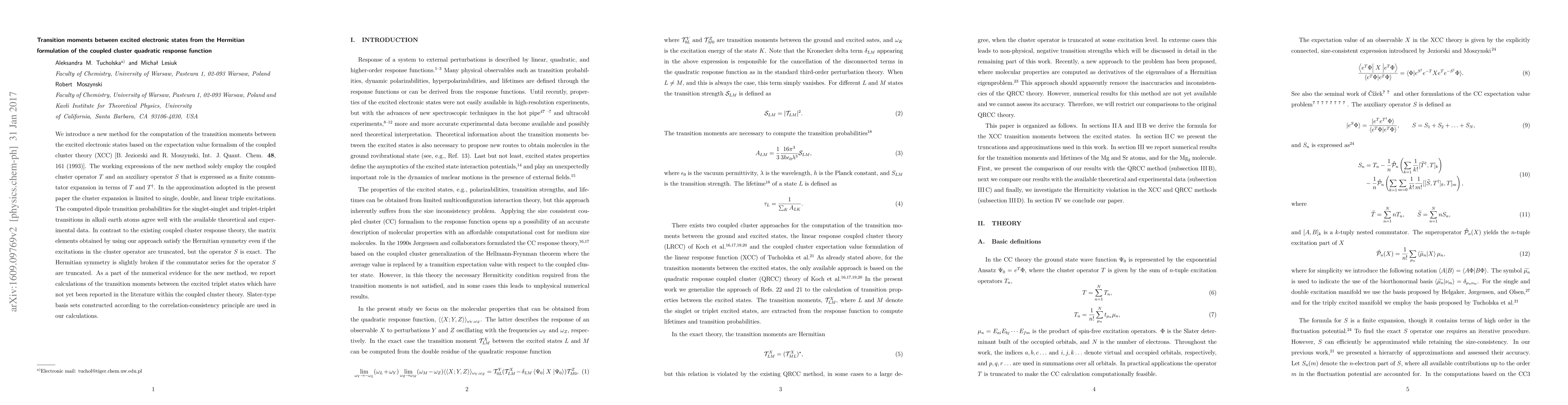 This paper introduces a novel method for calculating transition moments between excited electronic states using the Hermitian formulation of coupled cluster quadratic response theory, which employs only coupled cluster amplitudes. The method accurately computes dipole transition probabilities and satisfies Hermitian symmetry, even with truncated excitations, and reports new calculations for triplet state transitions.